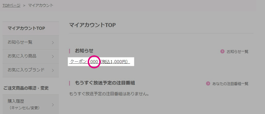 ご利用いただけるクーポンがある場合、マイアカウントのお知らせにて、コード番号をご確認いただけます。