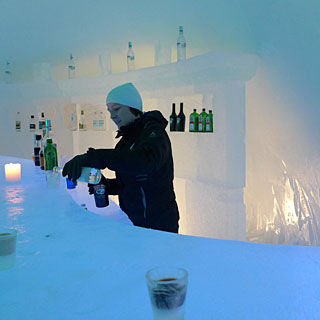 写真左上から1枚目:<アイスホテルのアイスバー>グラスもアイスでできています。