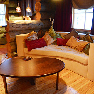 3枚目:<カクシラウッタネンのお部屋>フィンランド語でkeloと呼ばれる大きな木で作られていて、60平米のお部屋には、フィンランド風サウナも、外にはジャグジーバスもついています。雪の中のアウトドアジャグジーも楽しめるのです。