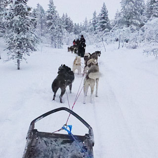 次に長距離バスで約4時間かけて向かったのは、オーロラで有名なサーリセリカ。世界的に人気のカクシラウッタネンというホテルがあるのですが、そこに三泊しました。ガラスイーグルという、ドーム型の宿泊施設が有名なのですが、予約がいっぱいだったため山小屋風のロッジ、ログキャビンに宿泊。別荘のようでとても素敵でした。そこで犬ぞりを初体験したのですが、これがとても楽しくて!6頭のハスキー犬が2頭ずつのペアになって走るのですが、先頭は真面目でリーダーシップがあり、後ろはやんちゃで、真ん中はちょっとなまけてしまう癖があって(笑)。先頭が真ん中の犬に怒ったり、後ろが発破を掛けたり、そんな犬模様が乗っているとよくわかり、面白かったですね。ここでもオーロラツアーに1回だけ参加しましたが、残念ながら見ることはできませんでした。