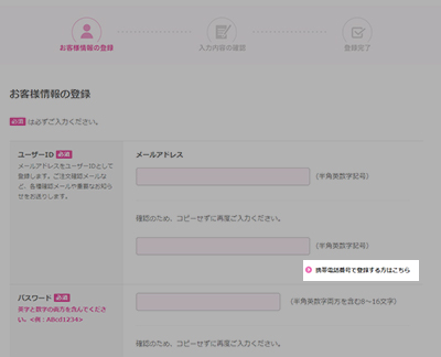 ①新規会員登録画面の「携帯電話番号で登録する方はこちら」リンクを押してください