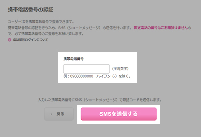 ②携帯電話番号の認証画面が開きますので、ユーザーIDとして登録したい携帯電話番号を入力し、「SMSを送信する」ボタンを押してください。