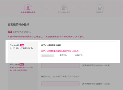 携帯電話番号をユーザーIDとして登録することで、今後ログインする際に登録した携帯電話番号をご利用いただけます。