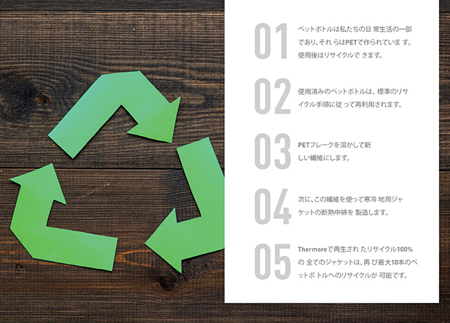 「Thermore」は、1972年にイタリアミラノで創業した機能中綿メーカー。常に最先端の断熱技術を追求し、研究開発に力を入れることにより、サスティナブルかつ高い保温性の中綿の開発・販売を行う技術開発のパイオニアであり続けています。その高い品質は世界的に評価され、大手スポーツメーカーや世界のトップメゾンなど名だたるブランドにも採用されています。今回は100%リサイクルペットボトルを使用したファイバー中綿「ジニアス」を使った、マフラー付のジャケットとロングコートをご紹介いたします。