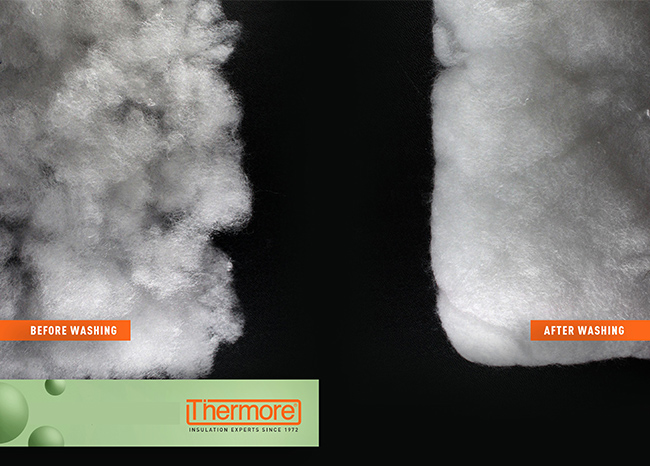 サーモアの板状の中綿は、洗いに強く耐久性があり、洗っても型崩れしないのが特徴。従来のファイバー綿は、洗いに弱く、今までのファイバー綿の常識を覆す高品質な製品となっています。