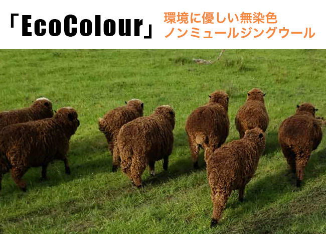 原色の羊のウールをそのまま使う“ナチュラルカラード”を採用しています。化学染料を使っていないので、二酸化炭素の排出・水資源の使用を軽減でき、環境負荷に配慮しています。