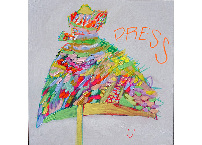 彼が好んで描くモチーフに、ドレスがあります。自分が見たもの、体験してきたことを思い描きながら筆を進めたそのドレスは、大胆で美しいシルエットとなり、彼の頭の中でイメージが色彩となって、心を動かす作品に生まれ変わります。今回、彼の描いたドレスをアパレルのプリントモチーフにしました。