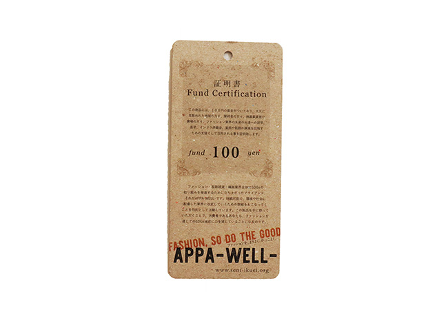 繊維育英会が行っているもう一つのプロジェクトAPPAーWELL(アパウェル)。ブルーサージの全ての商品に、このAPPAーWELL(アパウェル)のタグが付いています。このタグが付いた商品を購入することで、ウイルスワクチン開発支援や、コットン農家やカシミア農場、日本国内の障がい者の方々への就学・復学、インフラ準備金などに支援することができます。