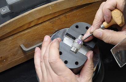 熟練のジュエリー職人が、天然石を傷付けないよう、細心の注意を払って手作業で石留めしています。