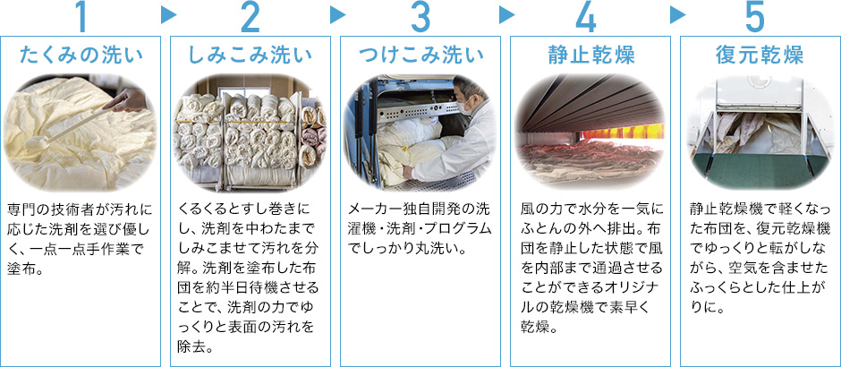3段階の洗浄工程2段階の乾燥工程で中わたまですっきり洗い上げ、ふんわり仕上げます。