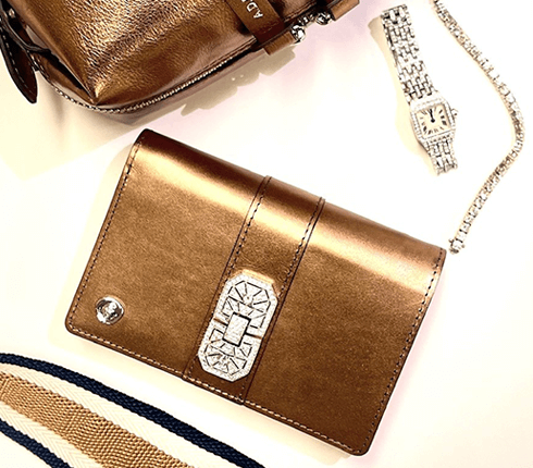 気分を上げる3つの要素 Point1:光を集めるクリスタルガラス Point2:華やかな箔を施したベビーカーフ※ゴールドカラーやシルバーカラーの箔押し Point3:配色の機能美 美しい色展開は、バッグとの相性でも発揮します。 従来の“アールデコウォレット”との大きさを比べると、コンパクトな仕上がりです。
