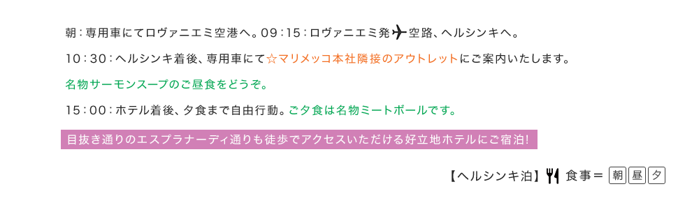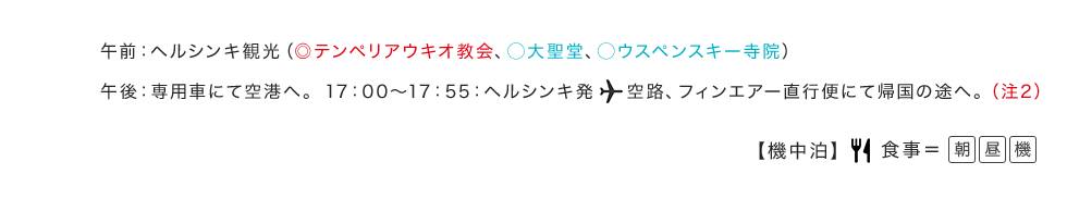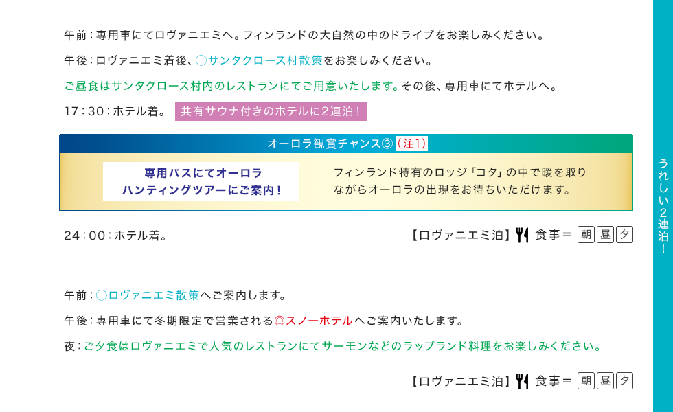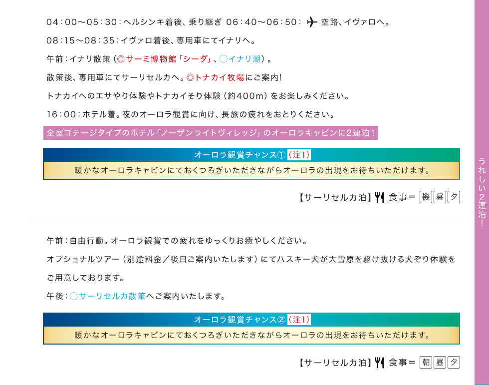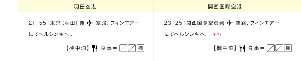 (注1) オーロラ観賞に適した時期・場所を選んでツアーを設定しておりますが、オーロラは自然現象のため必ずしも観賞できるとは限りません。 ご覧いただけない場合の返金等はございませんので、あらかじめご了承ください。 (注2) 関西国際空港↔ヘルシンキ間は添乗員が同行いたしません。添乗員とは2日目ヘルシンキ空港のイヴァロ行きの搭乗ゲートにて合流、7日目ヘルシンキ空港の出国エリアにて解散となります。 ※写真はすべてイメージです。