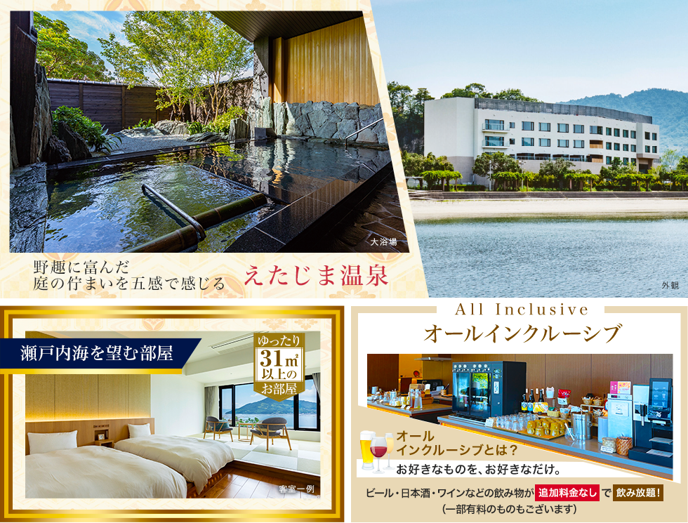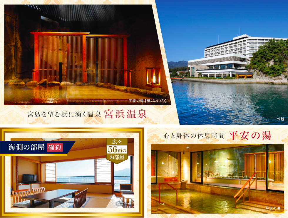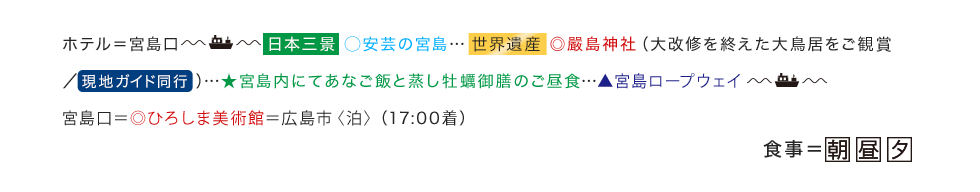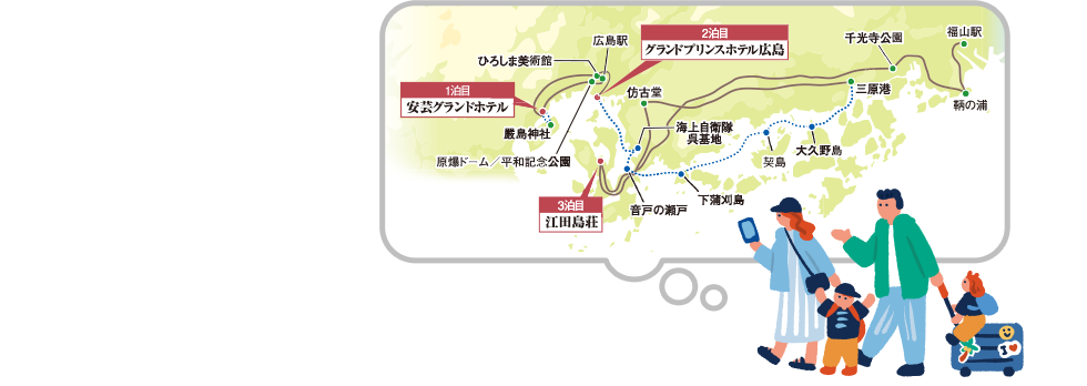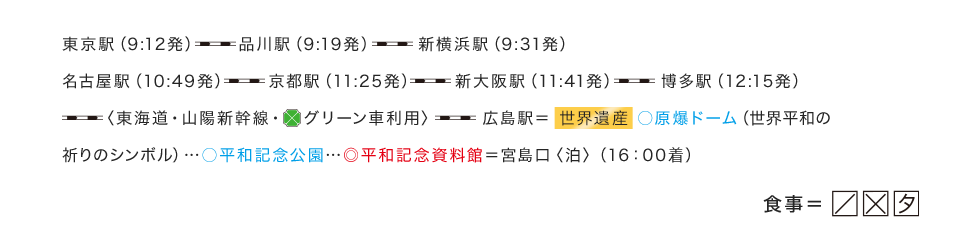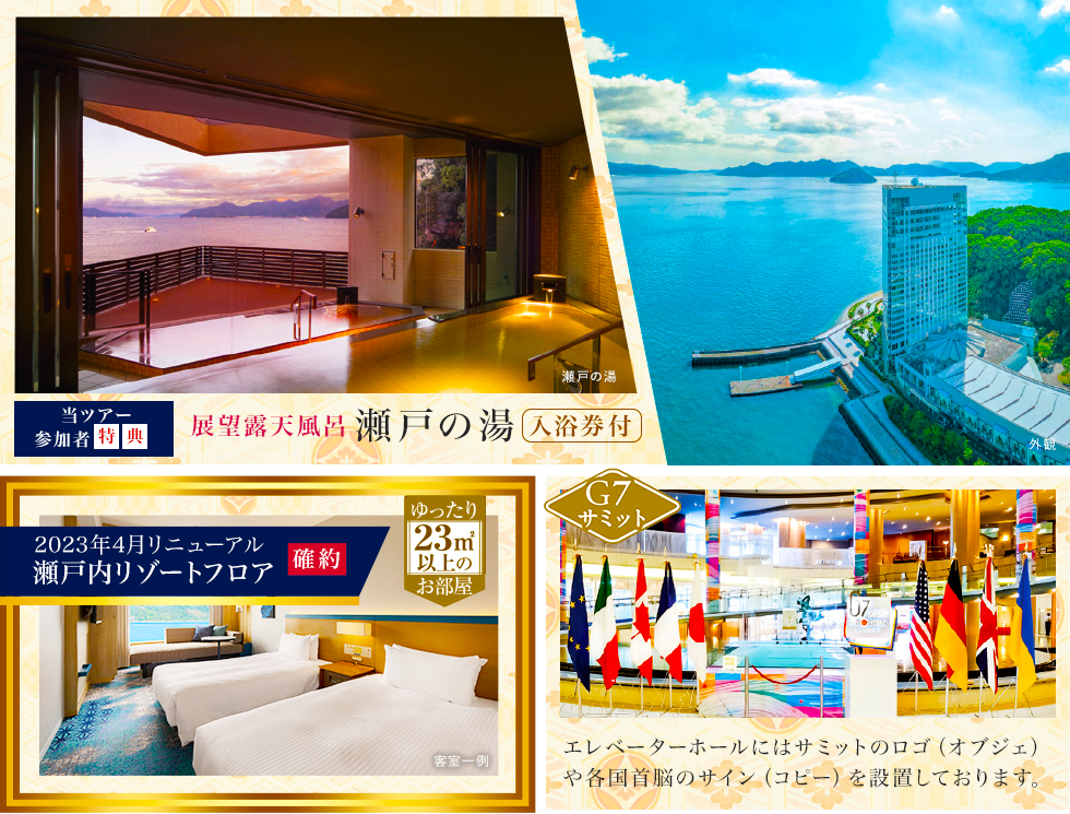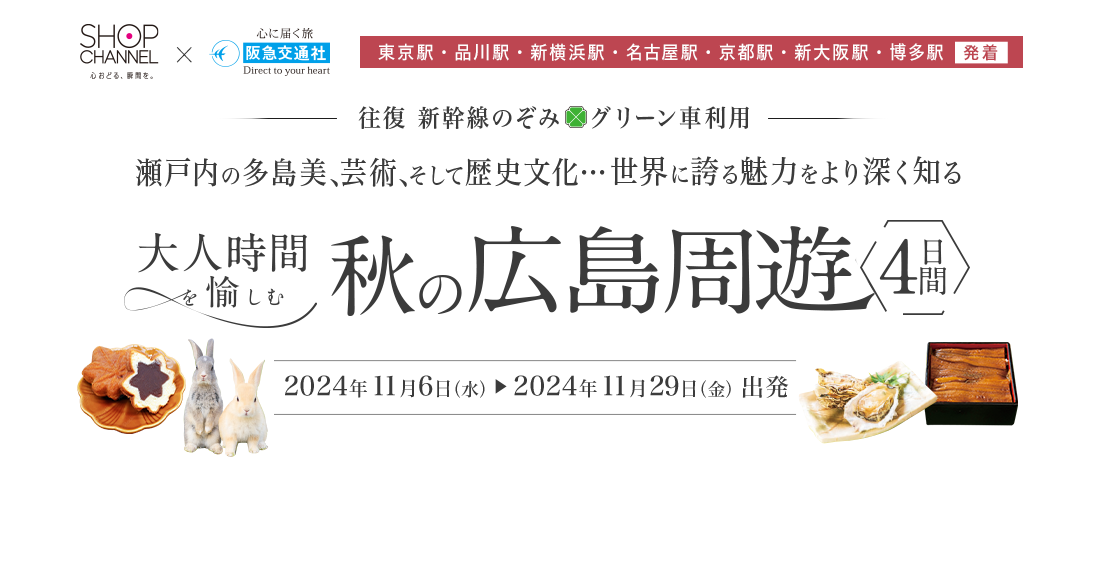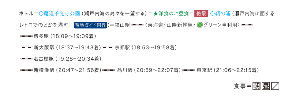 ご移動いただきます。(東京駅→広島駅、福山駅→東京駅間) 宿泊はAランクホテル以上(阪急交通社基準)のホテルをご用意。3泊目は(阪急交通社基準)にご宿泊。 ホテルで