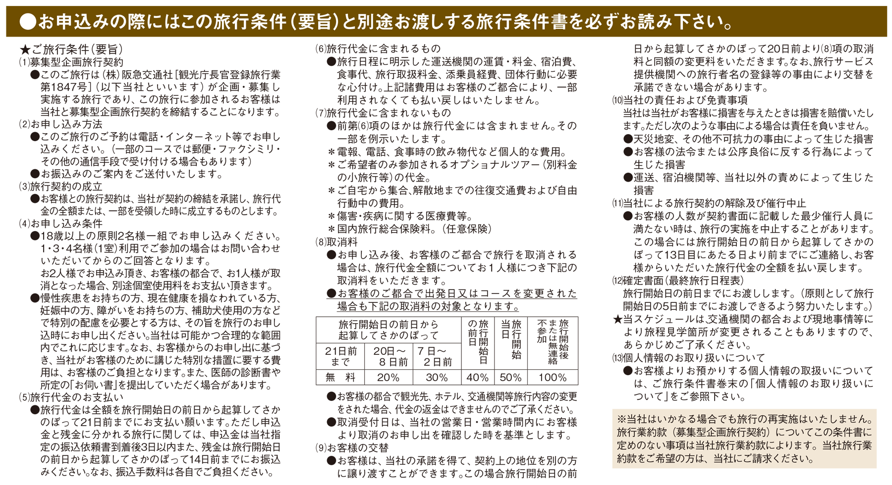 個人情報についてお客様の個人情報はお客様との連絡のために利用させていただくほか、お客様がお申し込みいただいた旅行において運送・宿泊機関等の提供するサービスの手配及び受領のための手続きに必要な範囲内で利用させていただきます。運送・宿泊機関などへの個人情報の提供について同意の上お申し込みいただきます。
