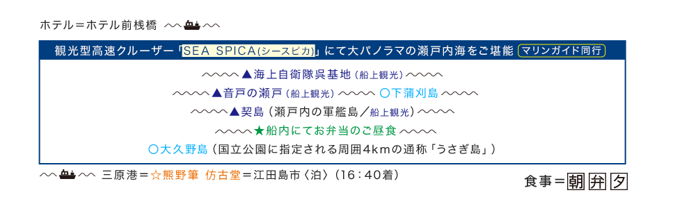 G7 広島サミットで各国首脳が乗船した観光型大型クルーザー「SEA SPICA(シースピカ)」にご乗船。 1泊目は海側の部屋を確約。
