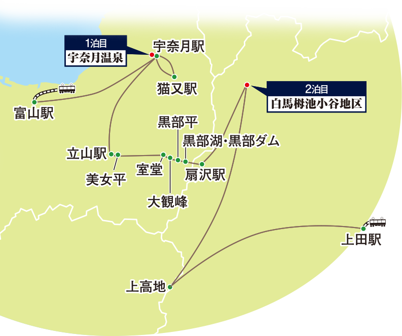 (※1)令和6年能登半島地震の影響により鐘釣駅が被害を受け当面の間、宇奈月駅・猫又駅間の営業運転となります。