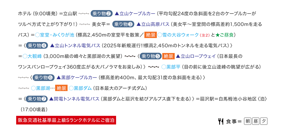 ○=下車観光(施設等へは入場しません)▲=乗車にての観光★=食事・ショッピング ■食事回数:朝食2回・昼食3回・夕食2回