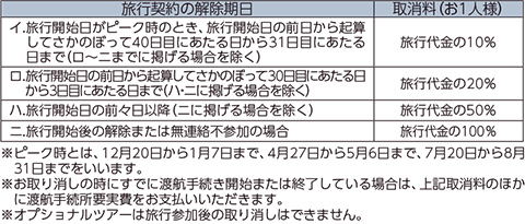 ●お申し込み後、お客様のご都合で旅行を取消される場合は、旅行代金全額についてお1人様につき下記の取消料をいただきます。
