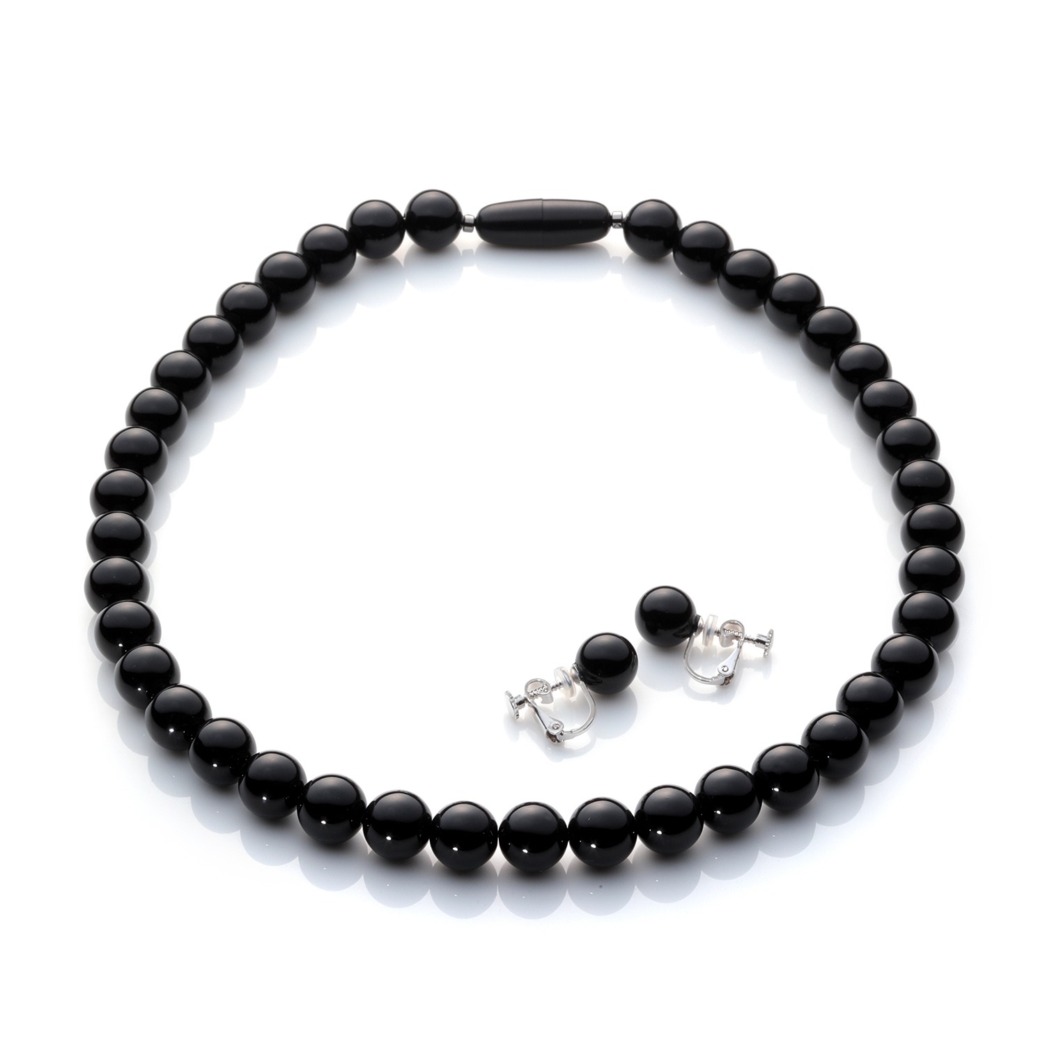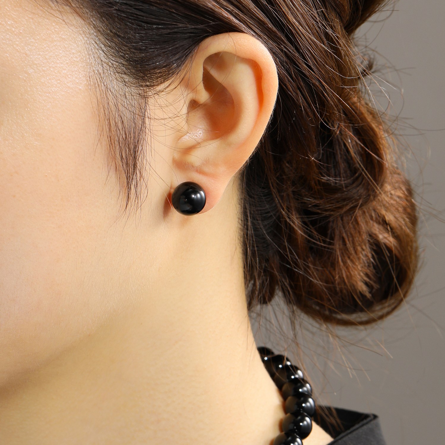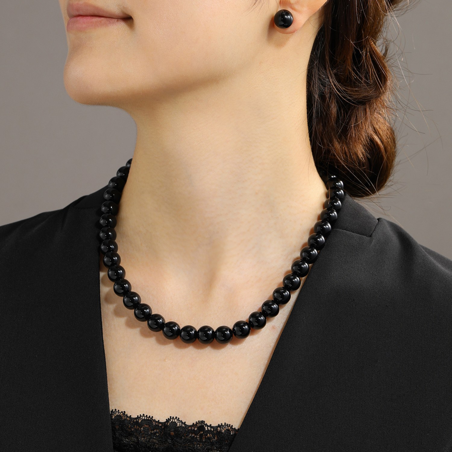 漆黒のジュエリーだからこそ引き締まって映える約10mm玉のサイズにこだわりました。ネックレス、イヤリング/ピアス、そして礼服と合わせた時の黒で統一された凛とした美しさを感じていただけます。