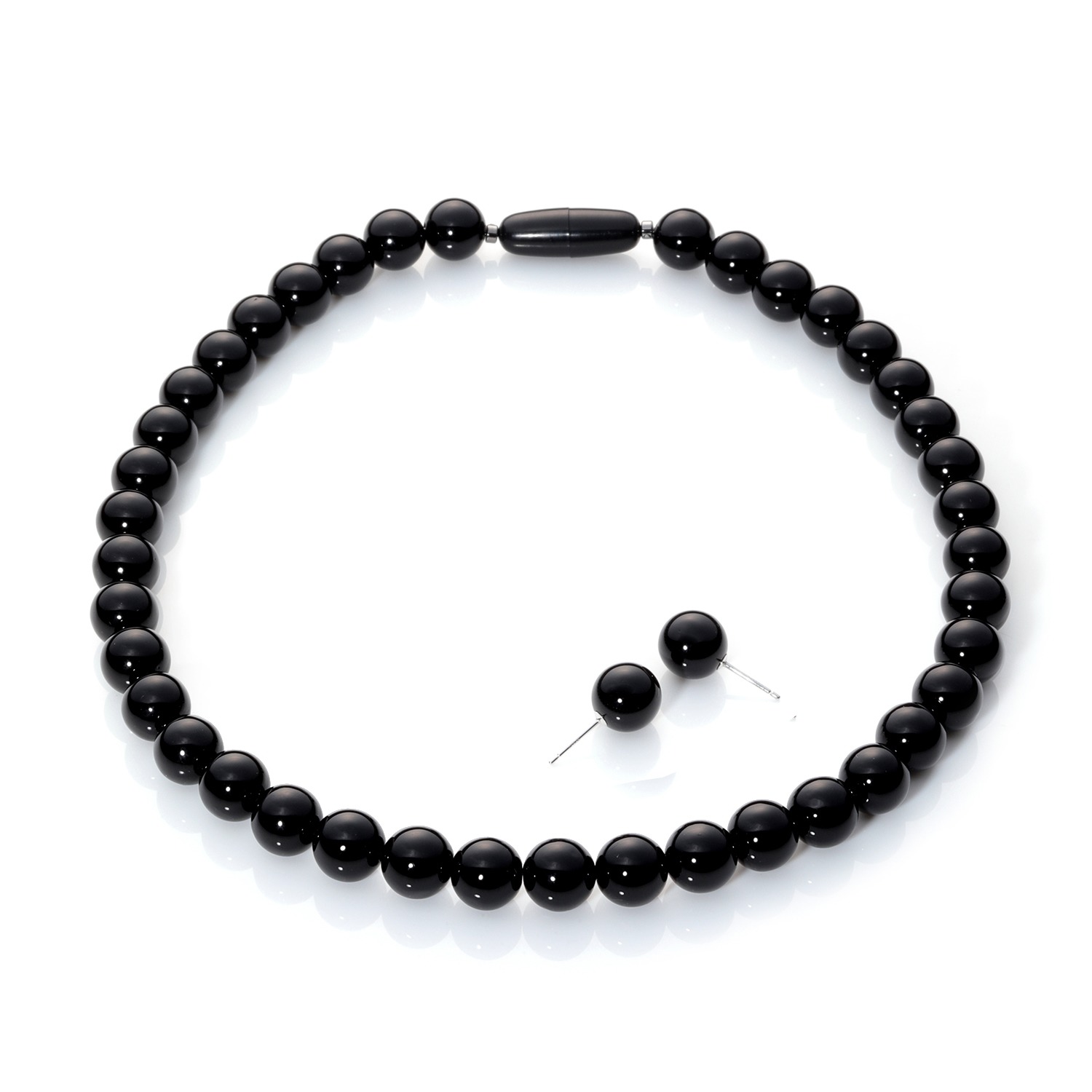 <彩花>より、約10mm玉のジェットを連ねたプレーンなネックレスと、同サイズのジェットを用いたスタッドタイプのイヤリング/ピアスをセットにしました。