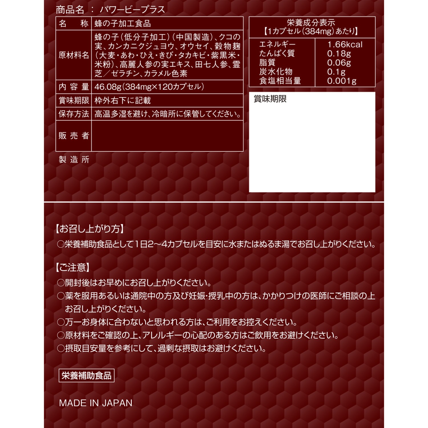 古来より貴重な栄養源として珍重されている、アミノ酸・脂肪酸・ビタミン類を含む蜂の子に、“精”“気”“神”という考えに基づく厳選素材を配合した、パワーサプリメント「パワービープラス」です。