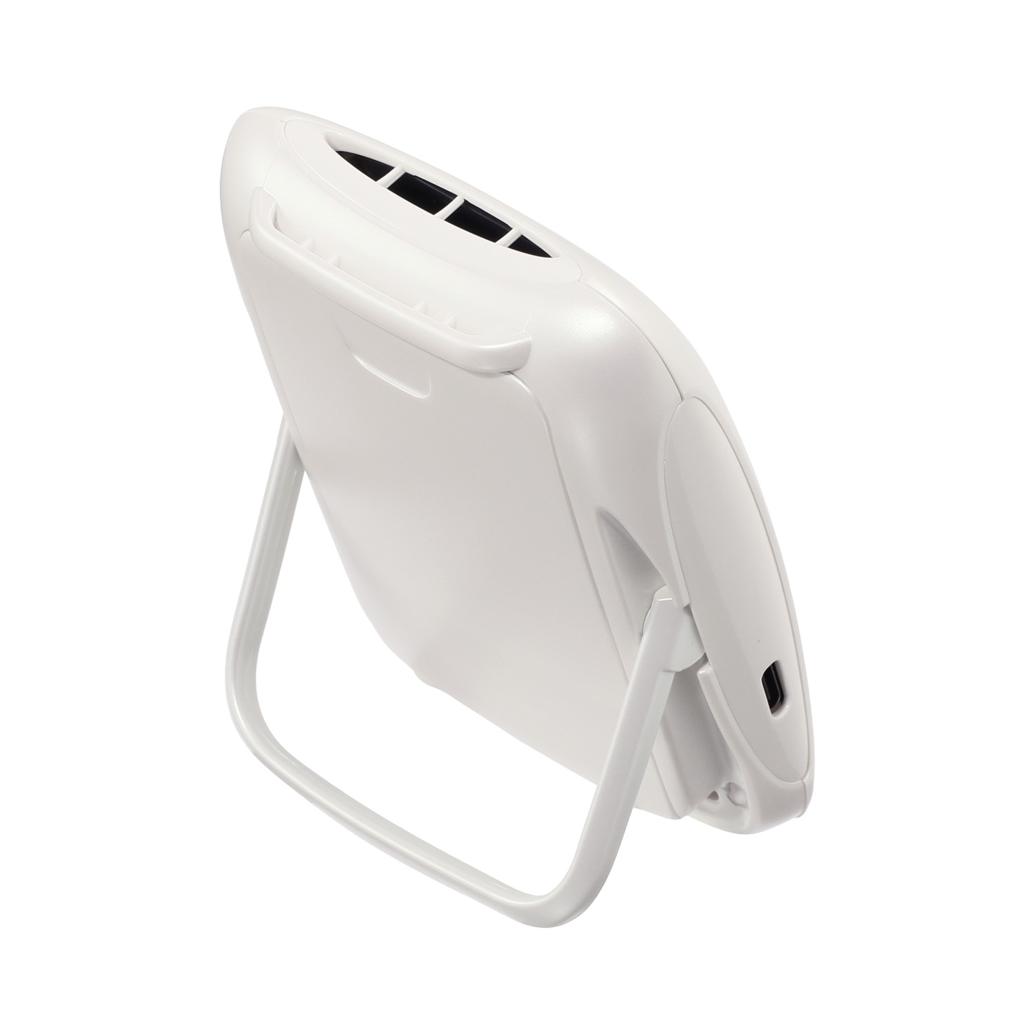 充電式になっているため、卓上だけでなく、首に掛けたり、洋服と一緒に掛けたりと、いつでもお使いいただけます。