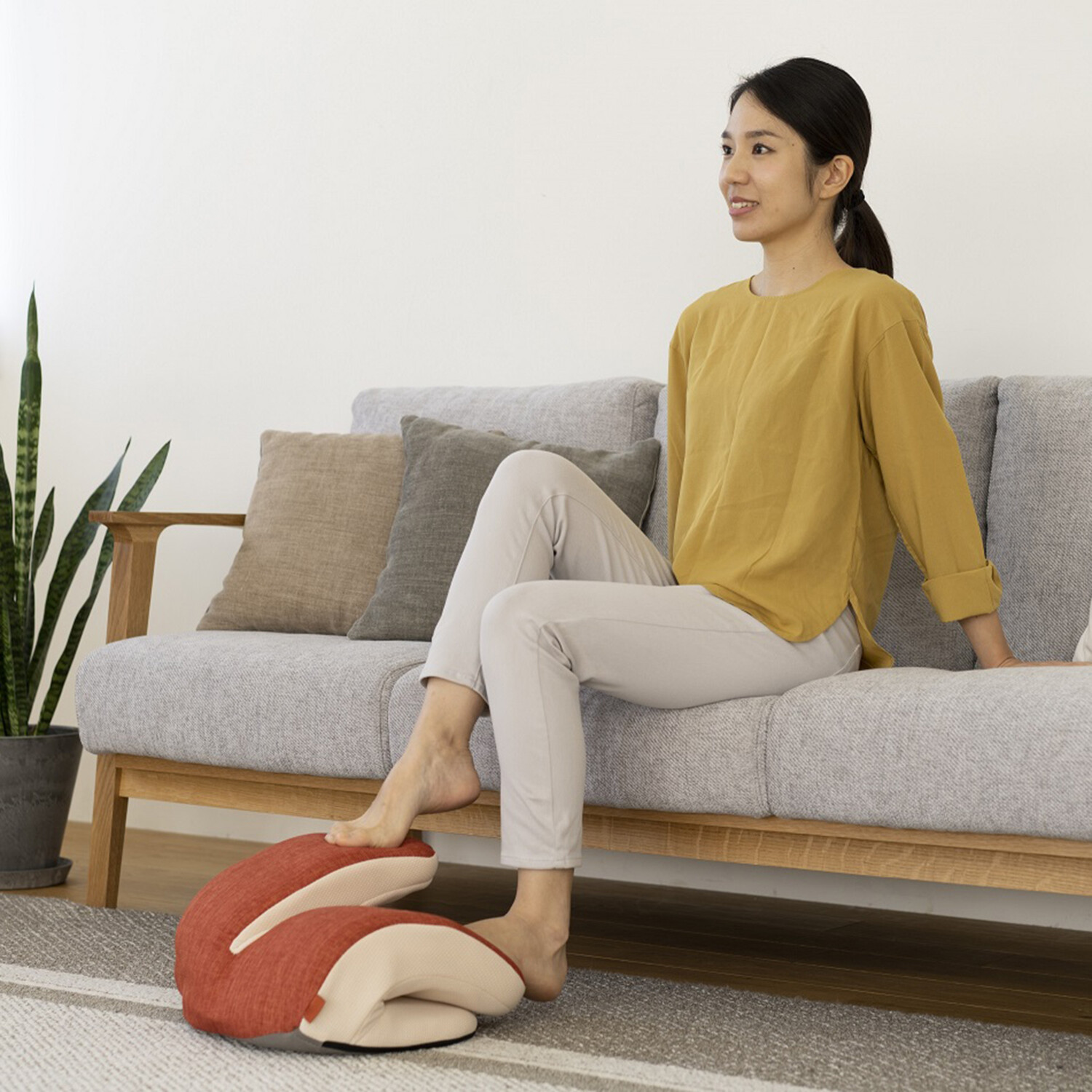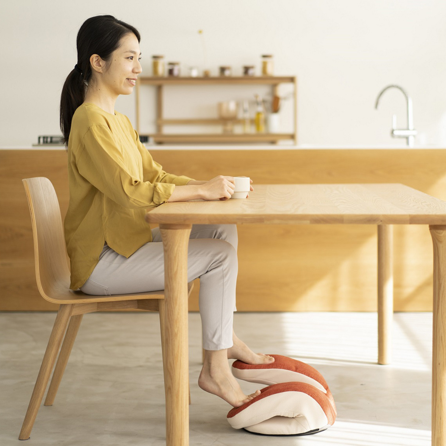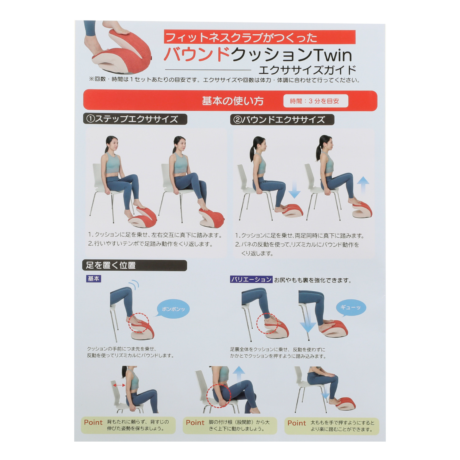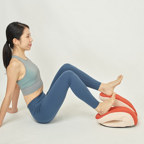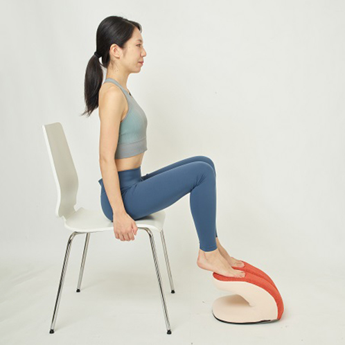 椅子に座ったまま、本品を両足でポンポンとバウンドするように踏むことで、下半身&下腹部周りの筋肉のエクササイズを効率よく行えるアイテム。