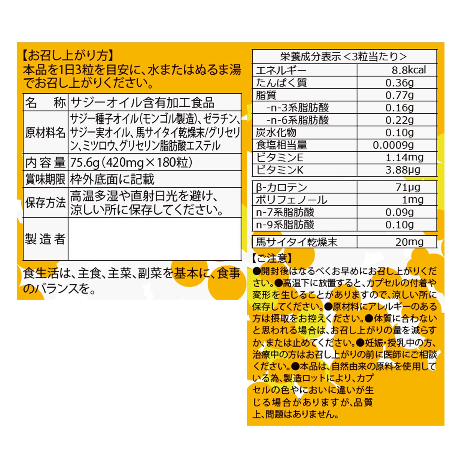 話題の美容系脂肪酸オメガ7、オメガ3、オメガ6、オメガ9をはじめ、ビタミンA、ビタミンE、ビタミンK、ルテイン、アミノ酸(たんぱく質)17種と多種多様な栄養素を含有しています。