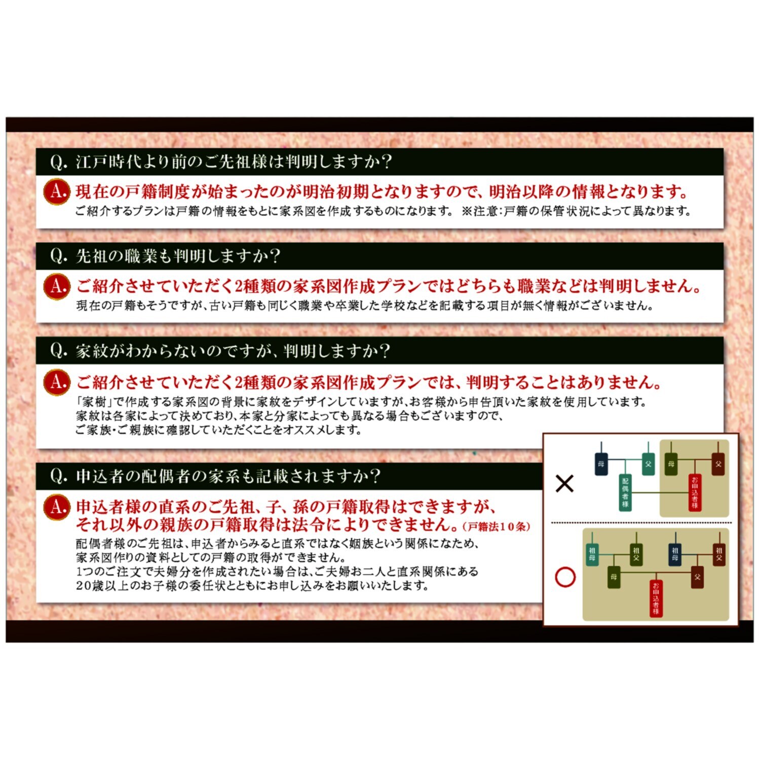 ・本サービスの提供物としての家系図はあくまでも観賞用のものであり、「事実を証明する文書・図画」として使用することはできません。