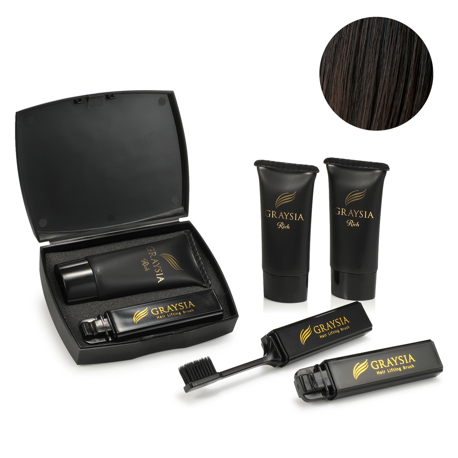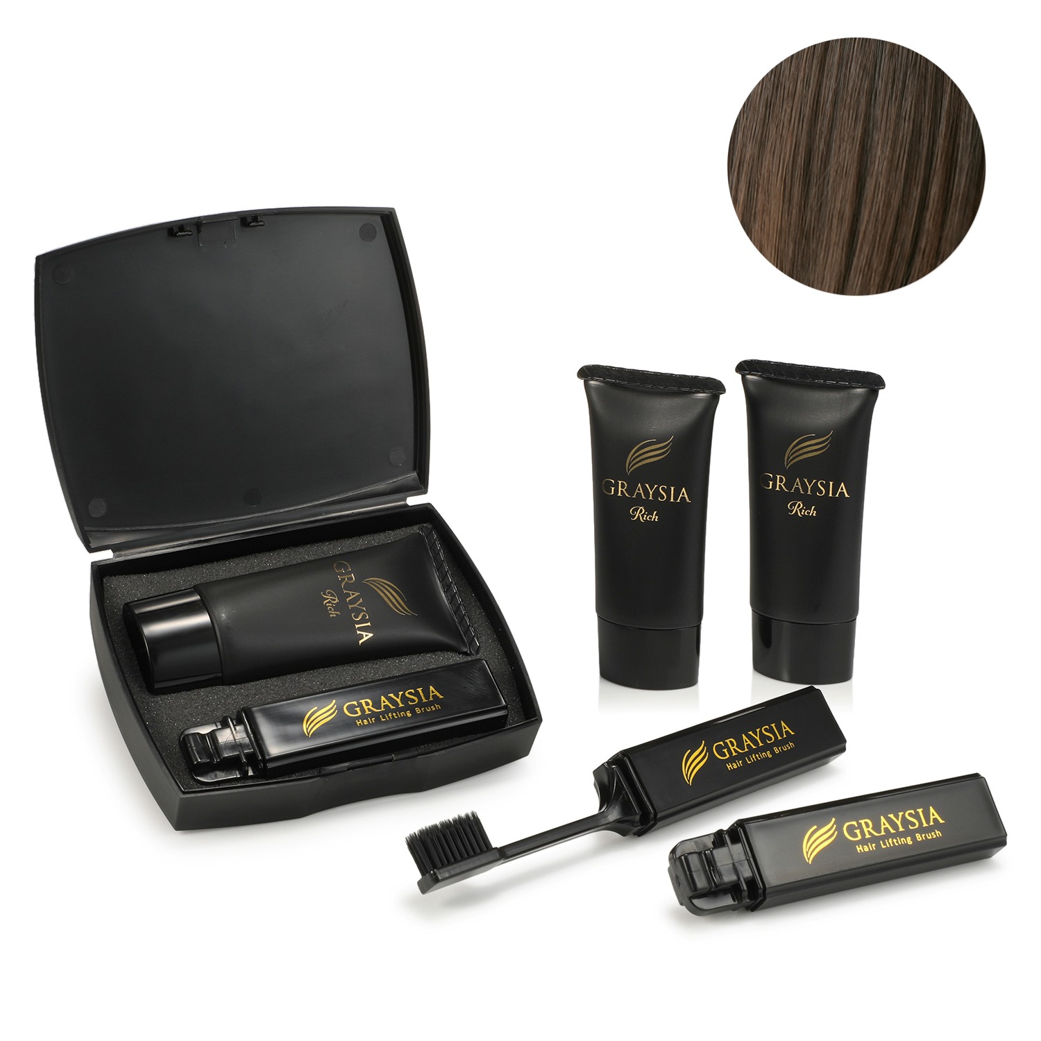 <グレイシア>より、お出かけ前も、ささっと簡単に、気になる白髪を隠し、自然で美しい髪型にアレンジできるトリートメント染毛料×3本と、ヘアリフティング・ブラシ×3本、専用ケースのセットです。