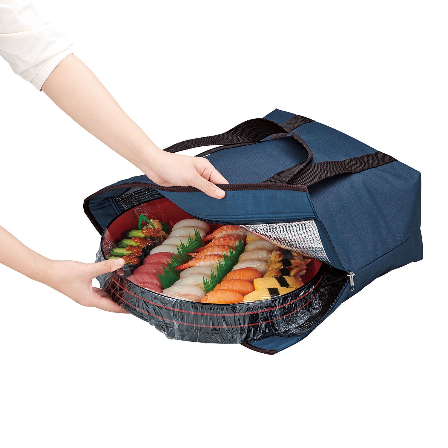 ヨコで使用すれば底が広いデリバッグとして使えるので、ピザやお寿司、オードブル惣菜、ケーキなどを傾けず持ち帰れます。