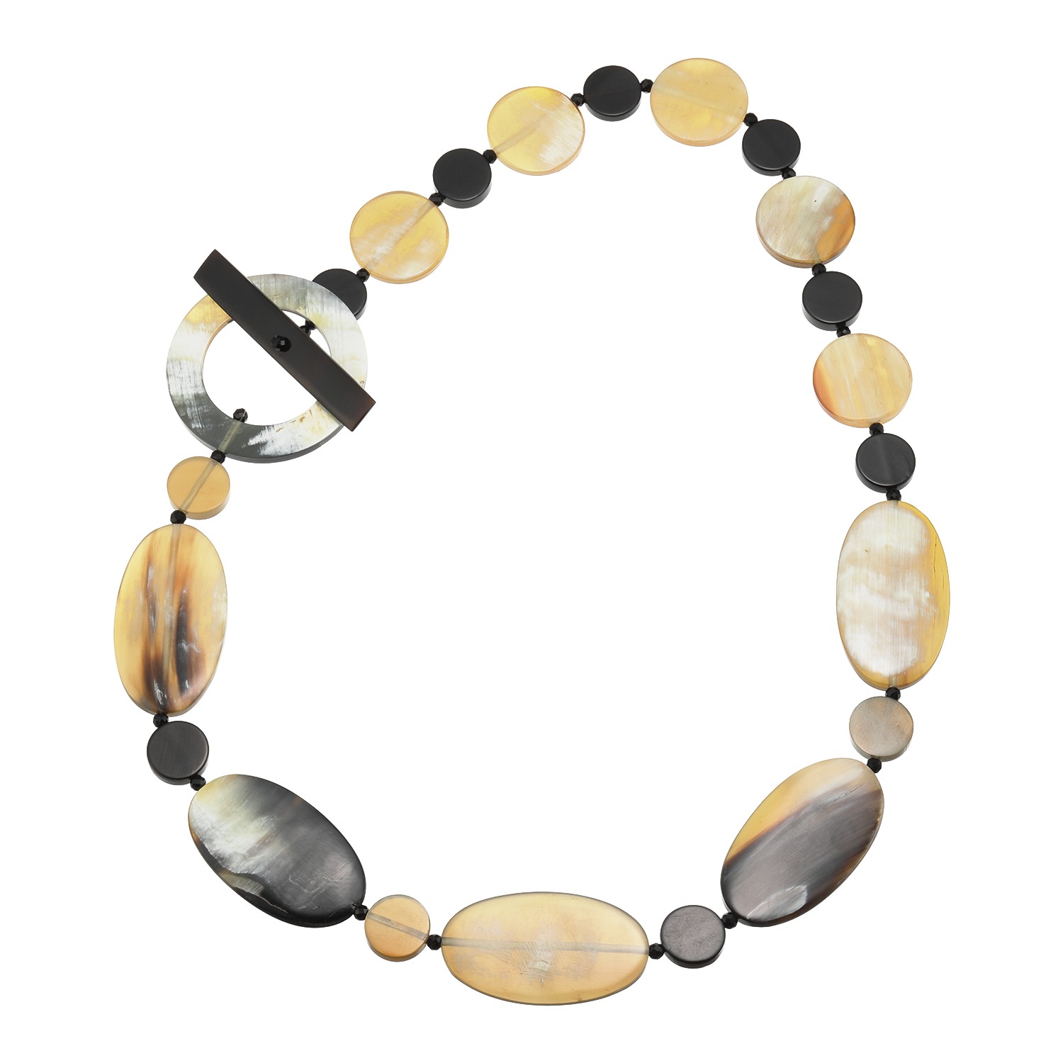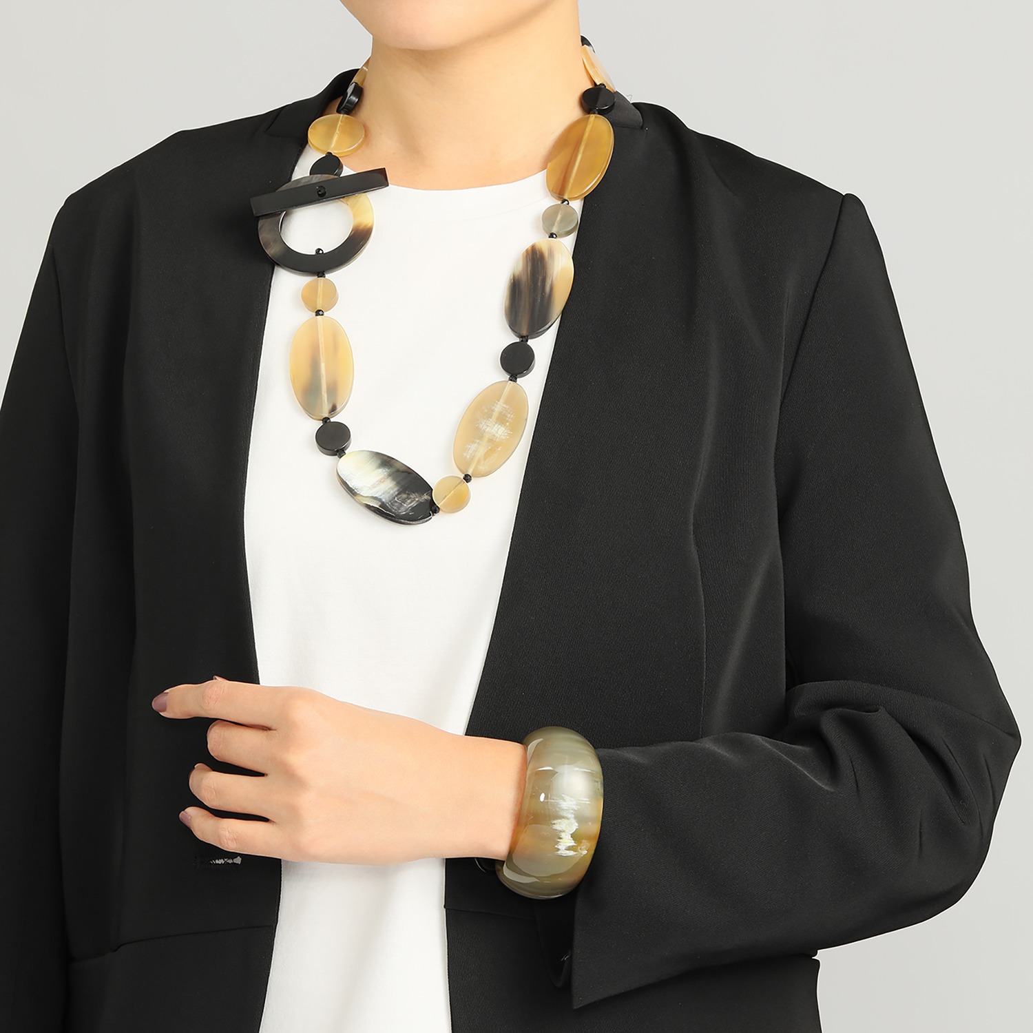水牛素材とブラックオニキスを用いたこなれ感のある、ボリュームロングネックレスです。