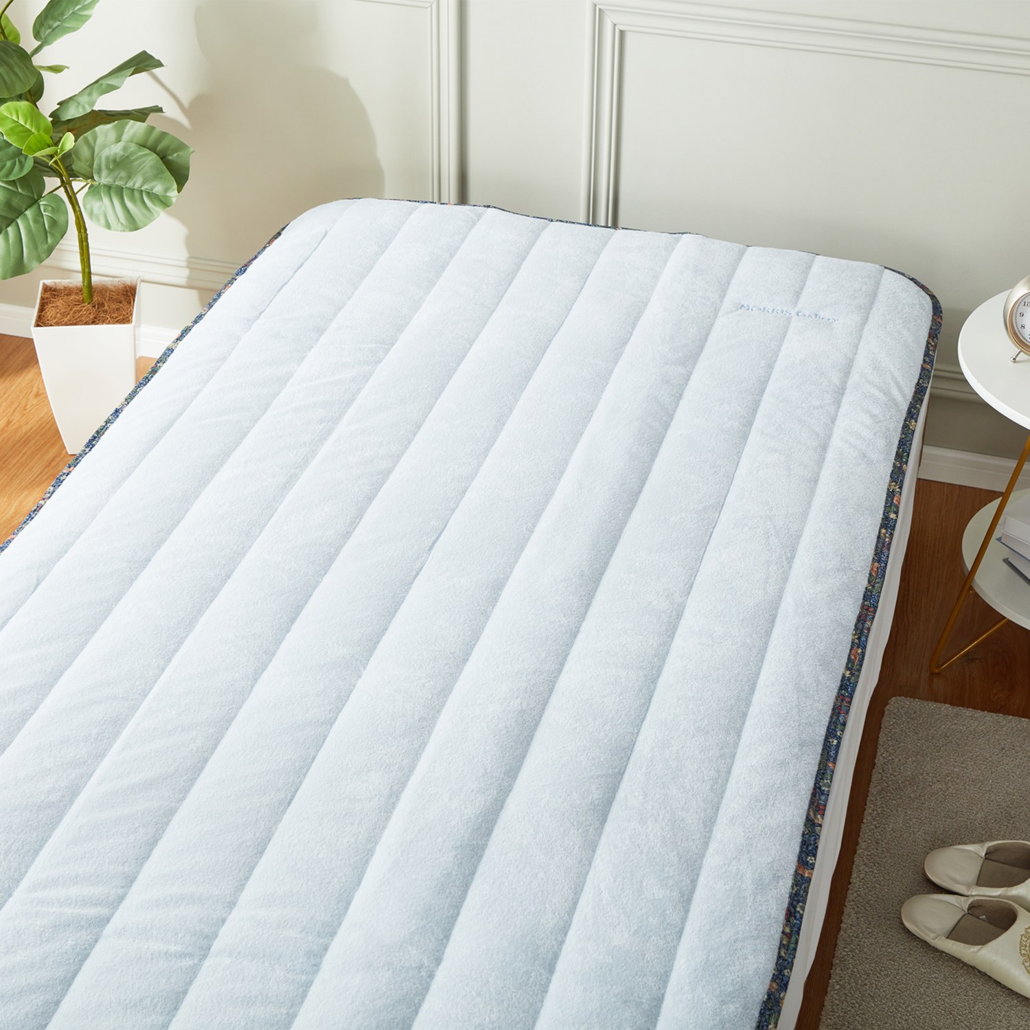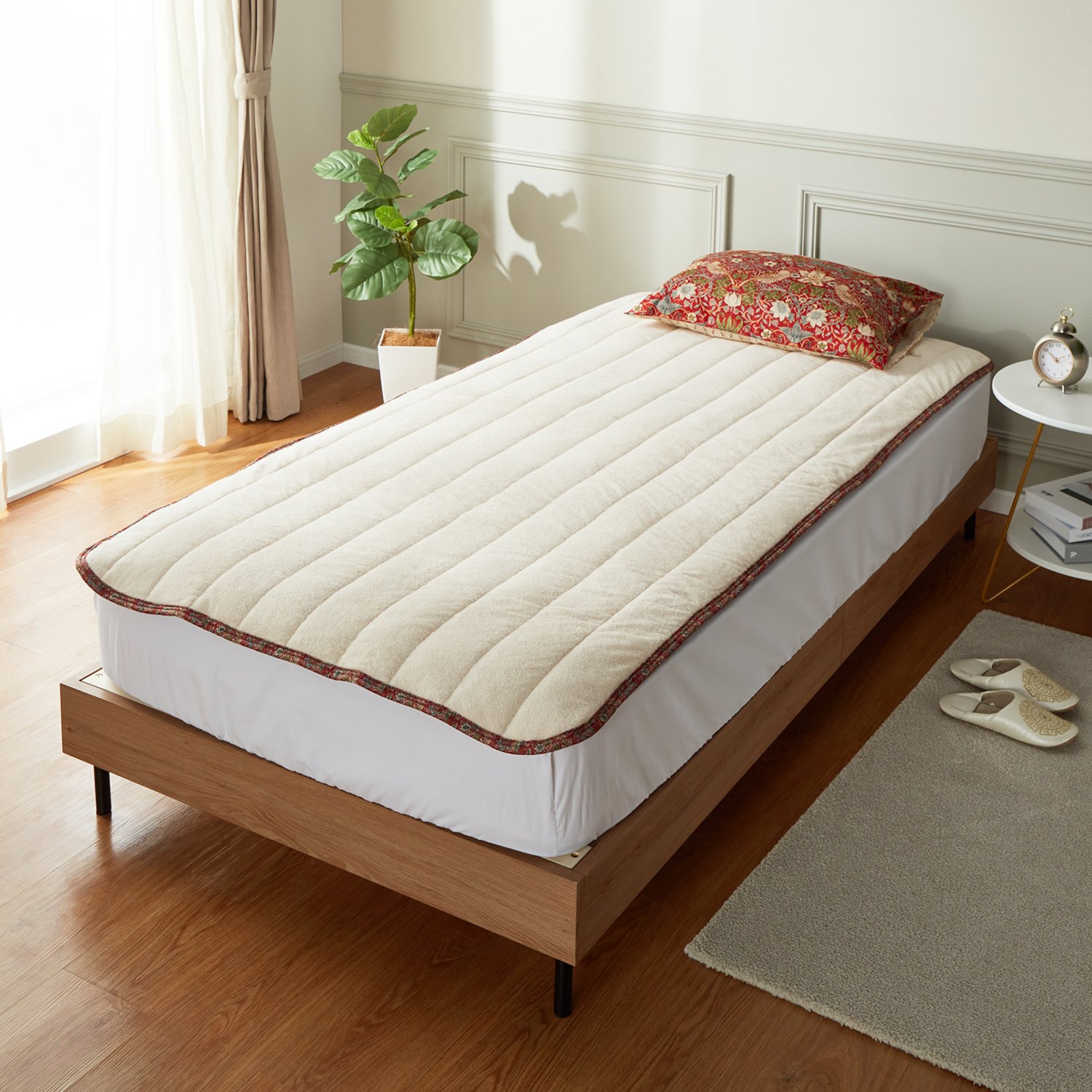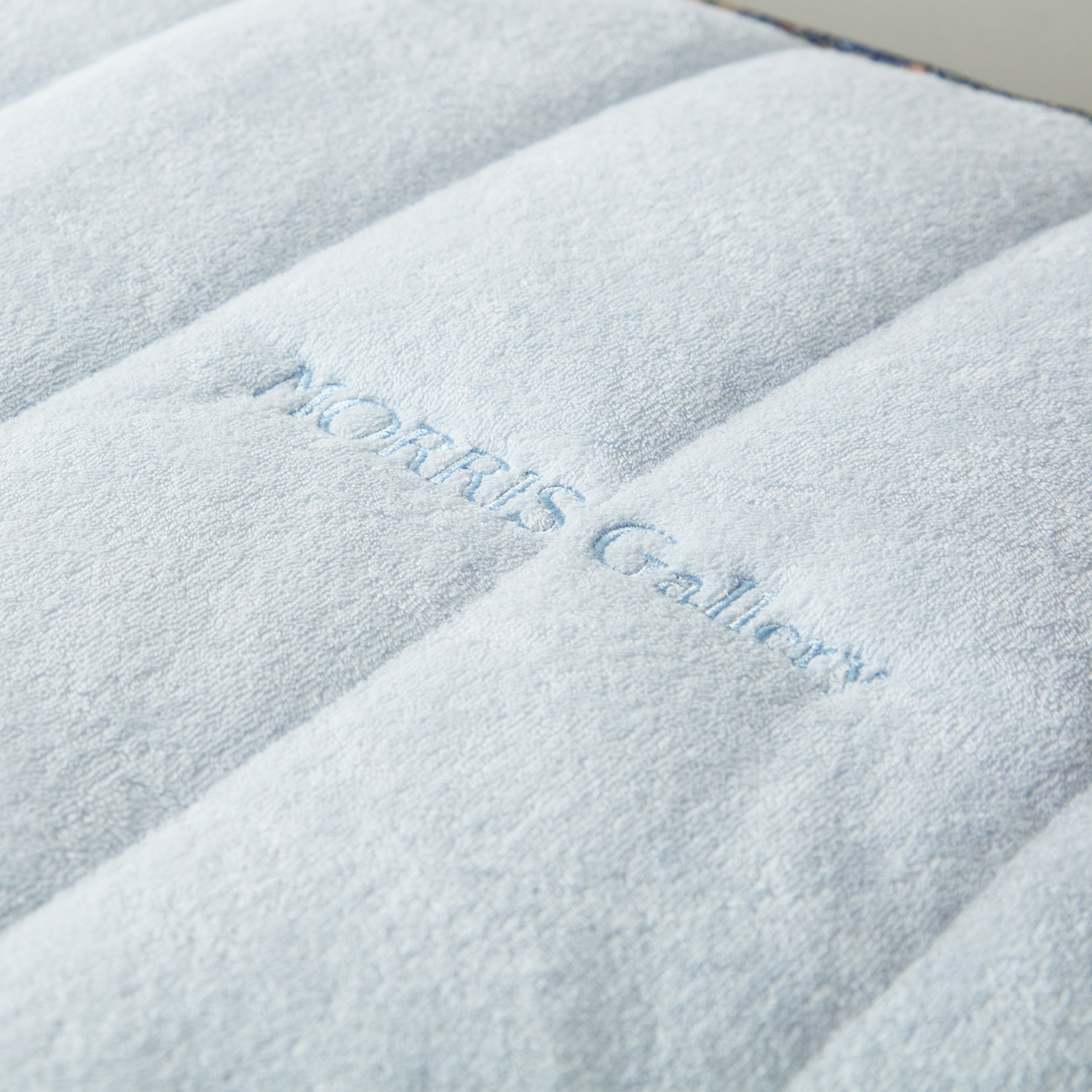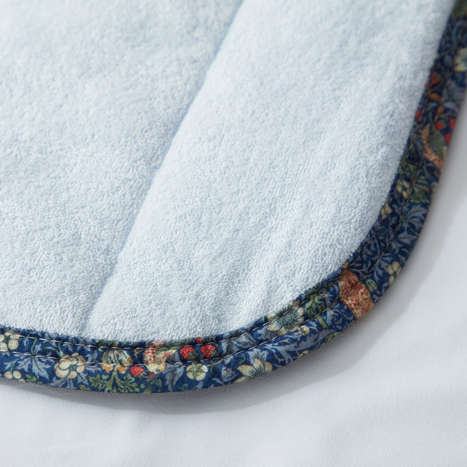 無地のコットンのシンカーパイルの周りを囲むヘムに、さりげなくウィリアム・モリスの人気のデザイン、“いちご泥棒”をあしらった敷きパッドです。