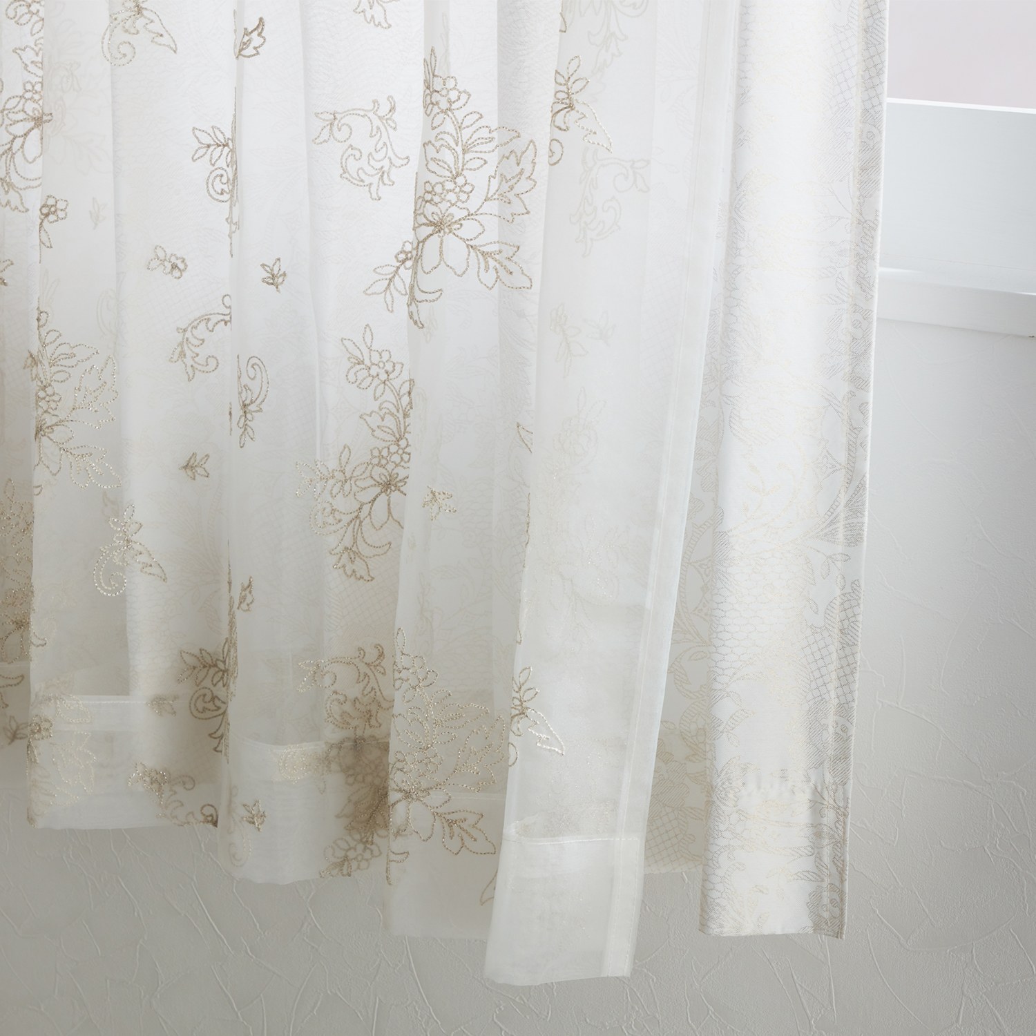 <ドレッシー>より、繊細なオーガンジー刺しゅうをほどこした生地とブライダルドレスのような美しい箔プリントをほどこした生地を使用した、二重レースカーテンです。