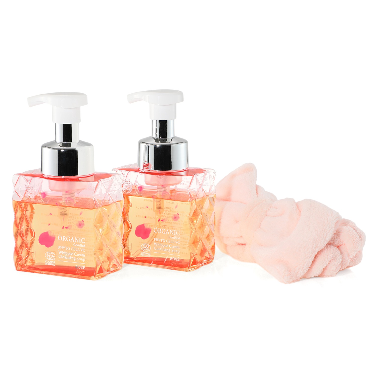 ビオール エコサートコスモス オーガニック認証取得 濃密泡洗顔でハリ潤い肌へ 美容成分100%配合! フィトセルVC ホイップ クレンジングソープ ロゼ 2本ターバン付特別セット