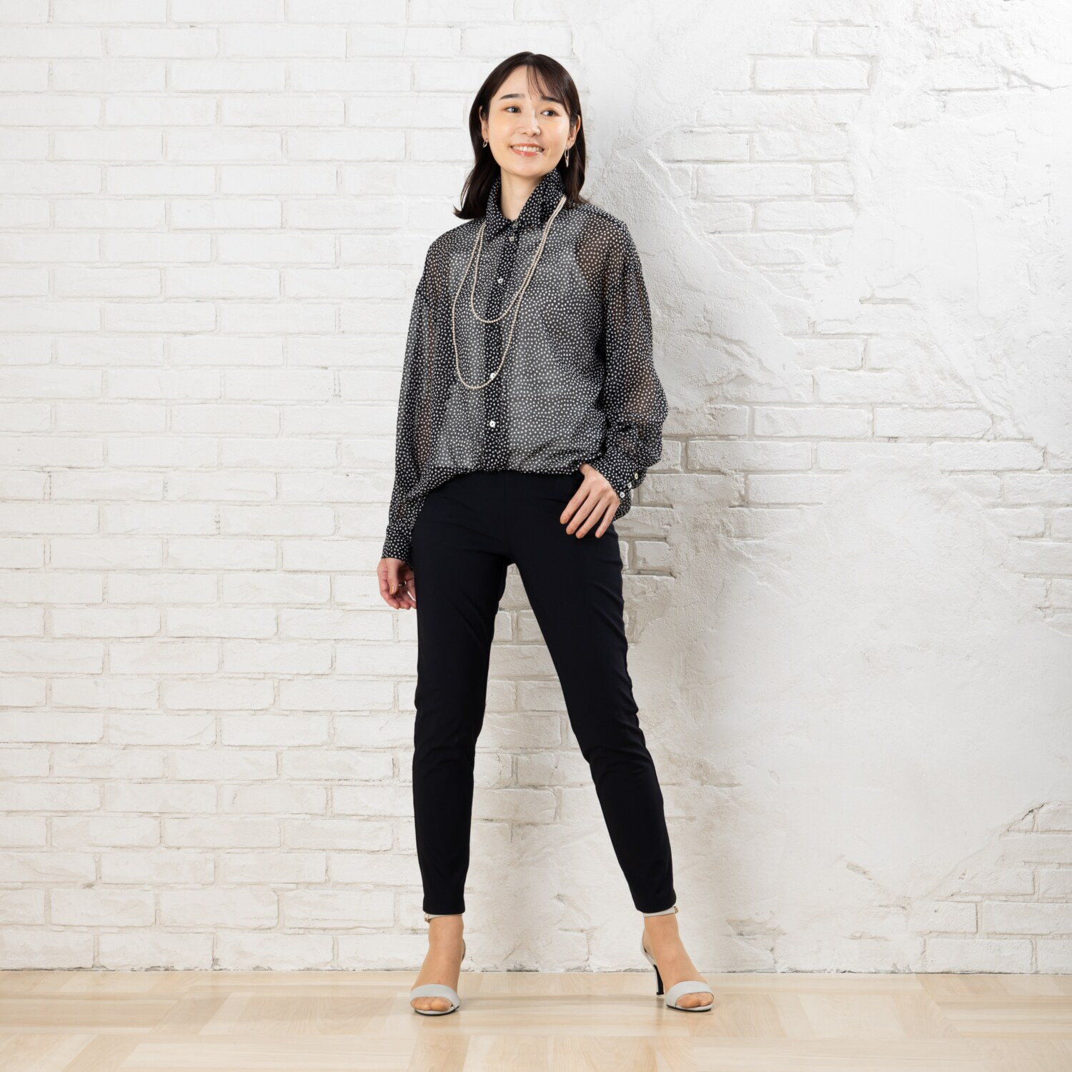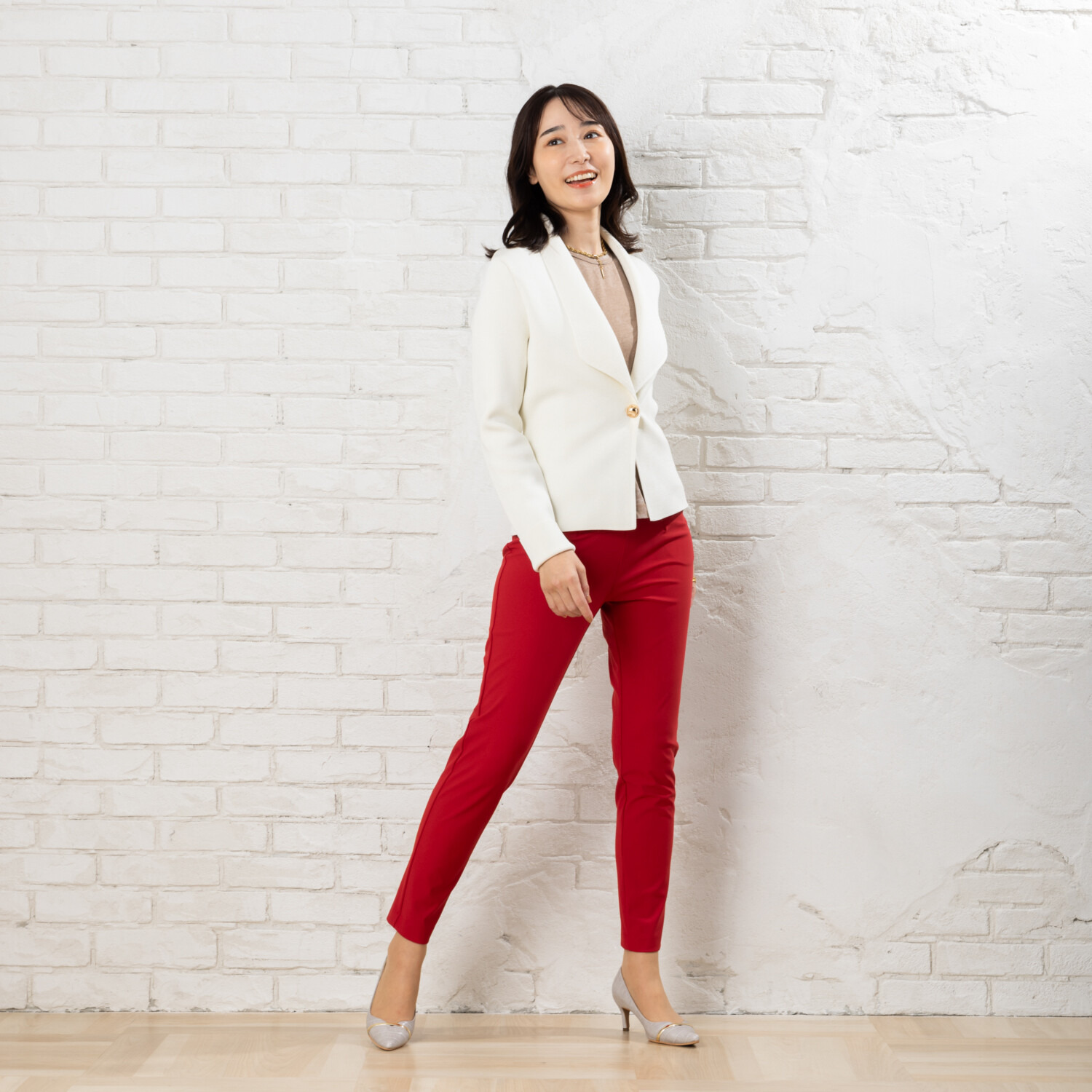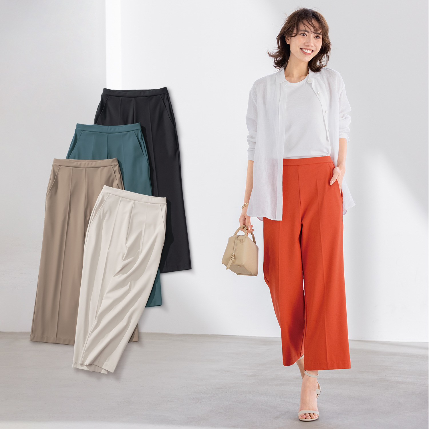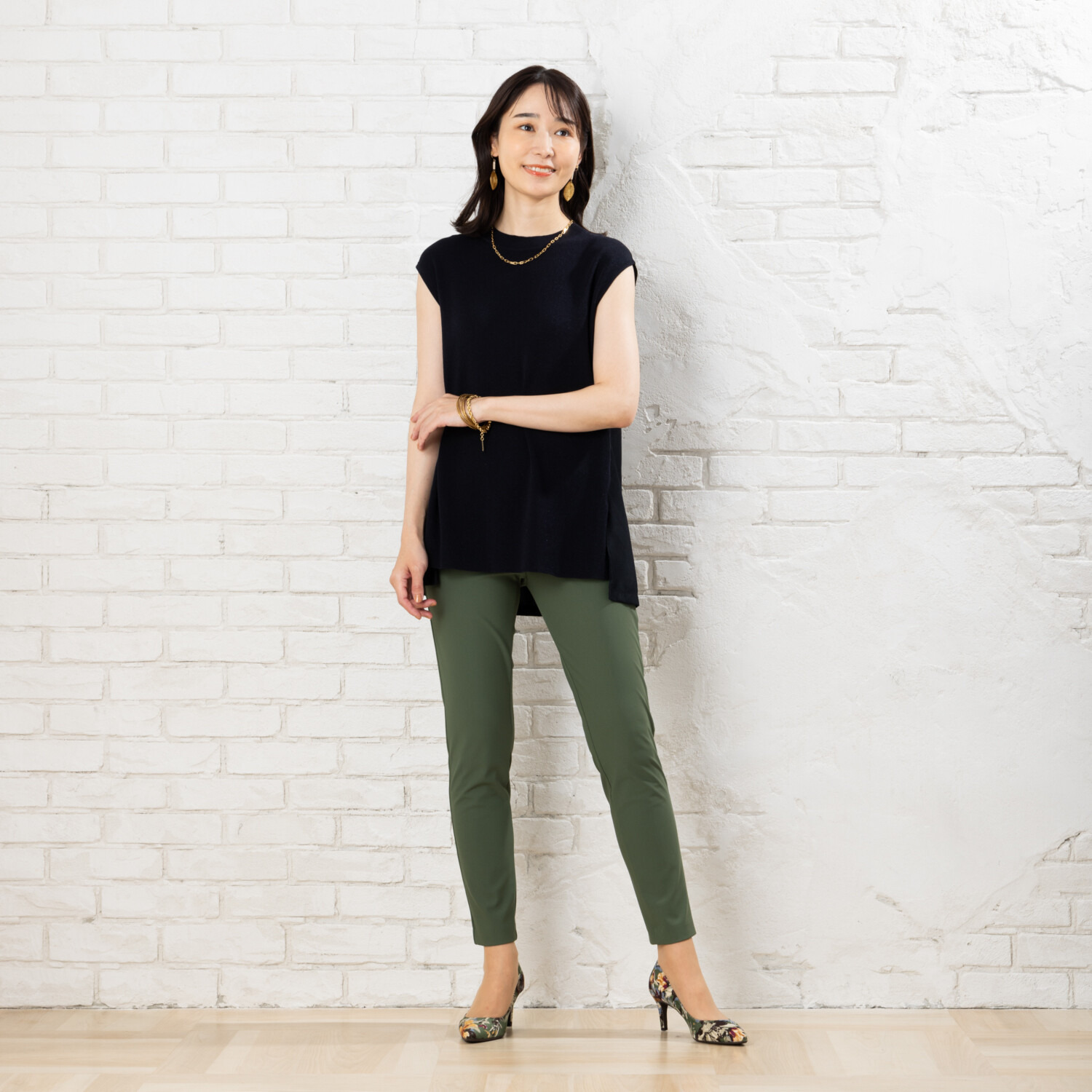 さらに膝位置を高めに設定することで、脚長効果が期待できるスタイリッシュな仕上がりに。