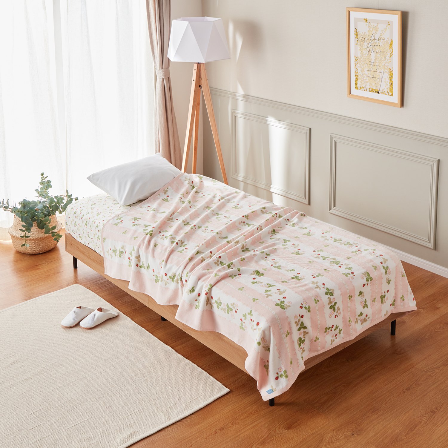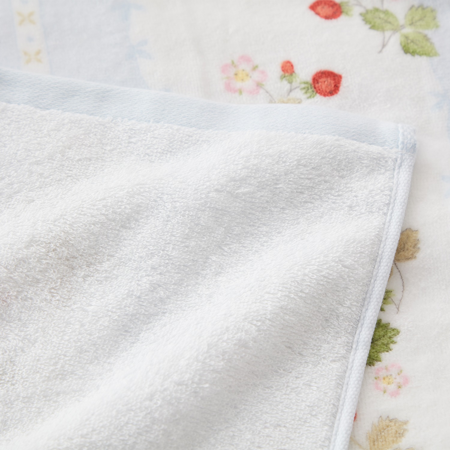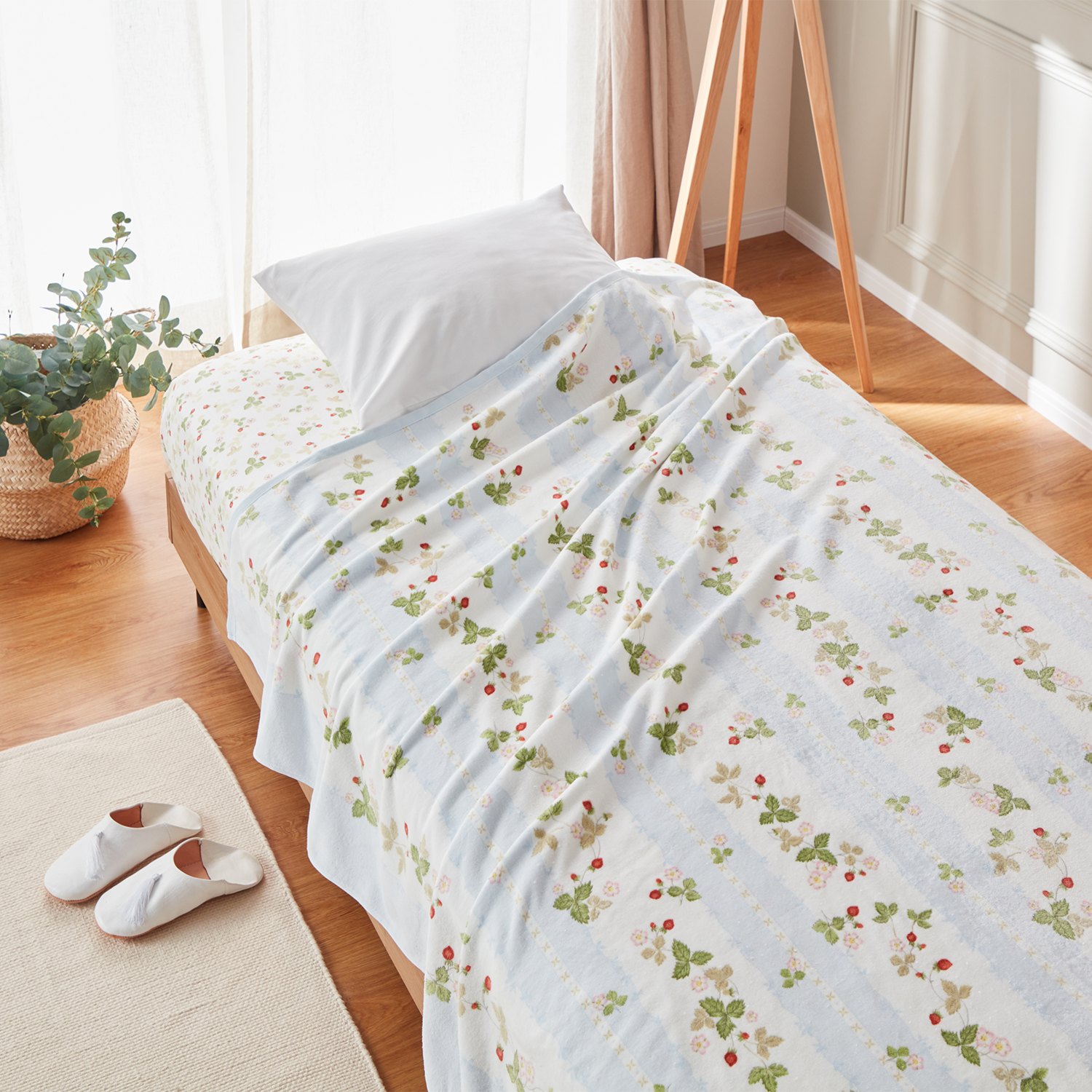 <ウェッジウッド>の代表的かつ人気のデザイン“ワイルドストロベリー”柄をストライプ調でほどこした、コットン100%のタオルケットをご紹介します。