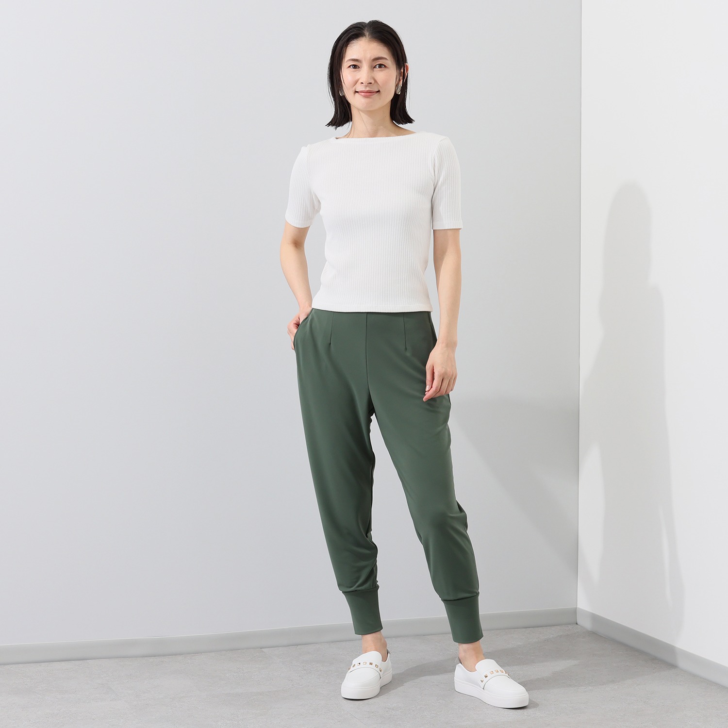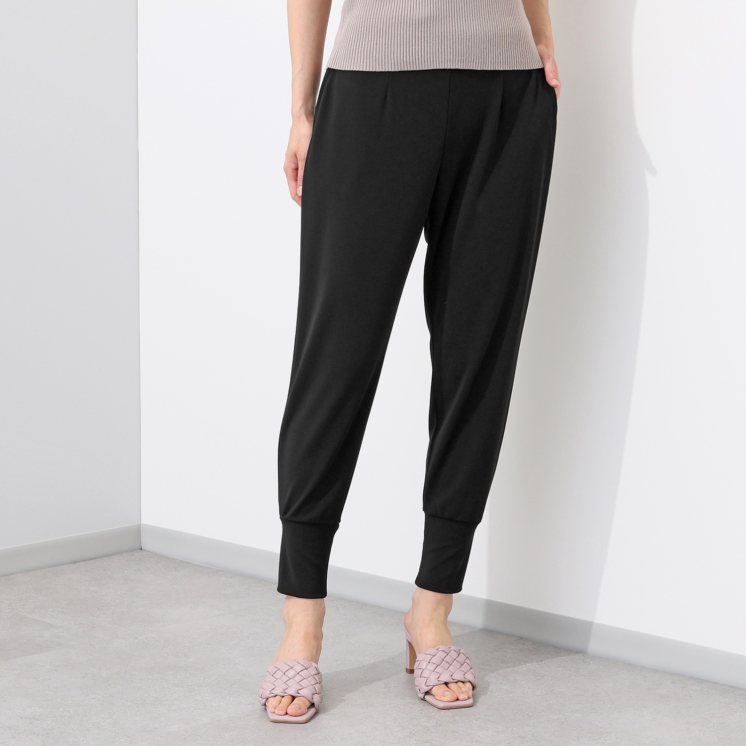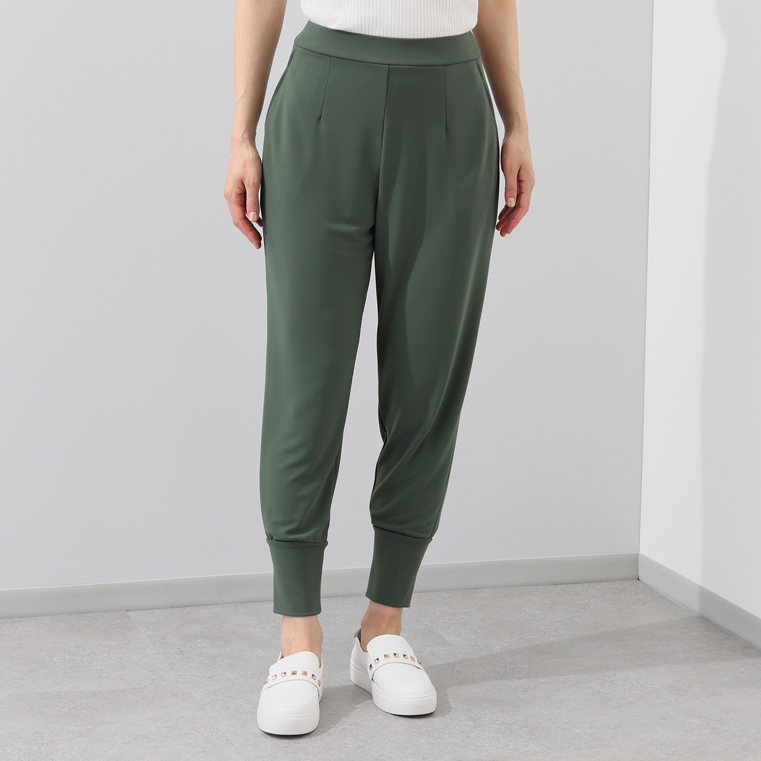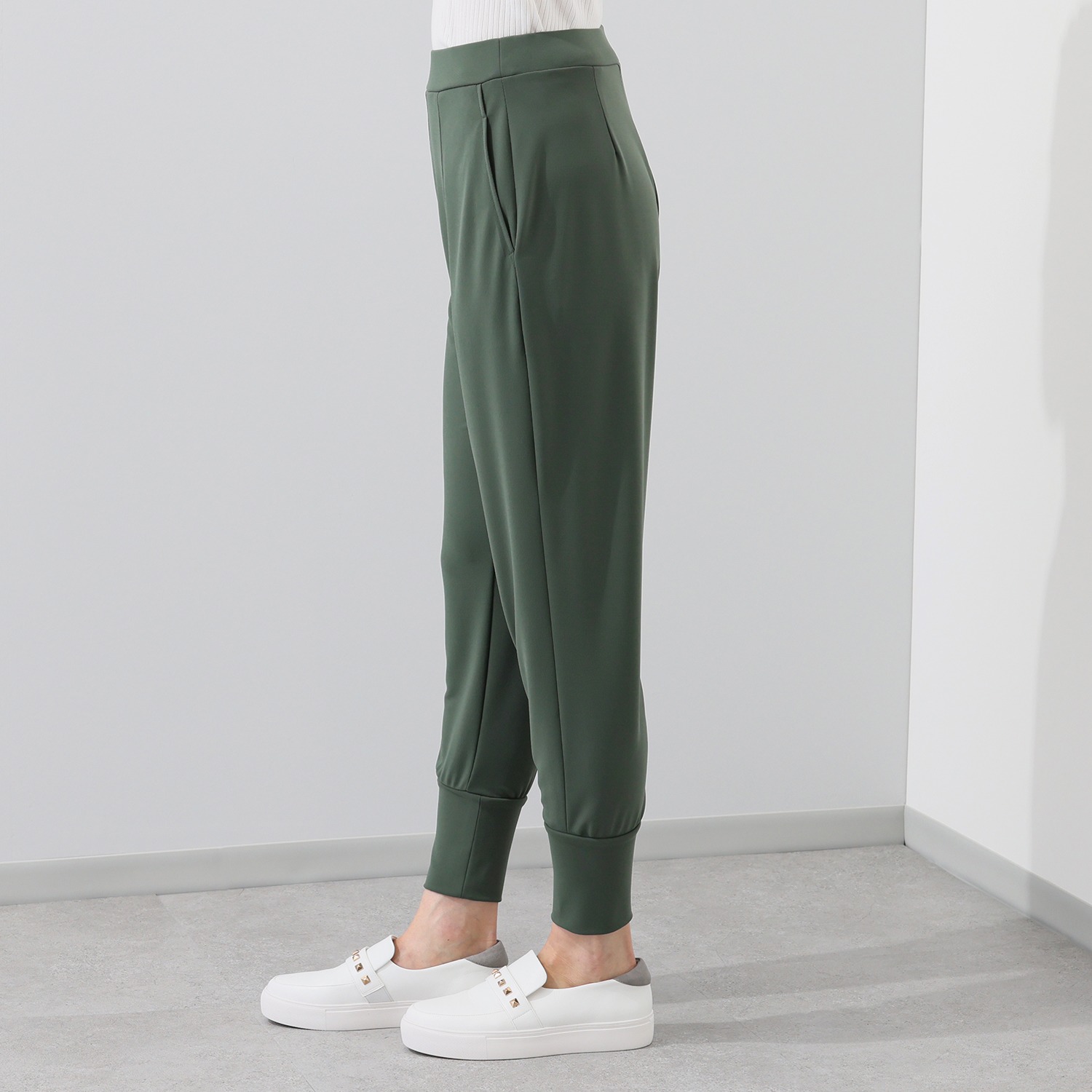 ウエスト周りはゆったりとしたつくりながら、裾幅を細くすることで、ヒップラインをカバーしつつ、全体をすっきりとした印象に演出します。