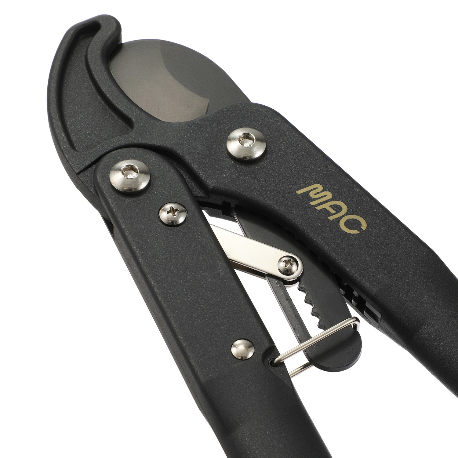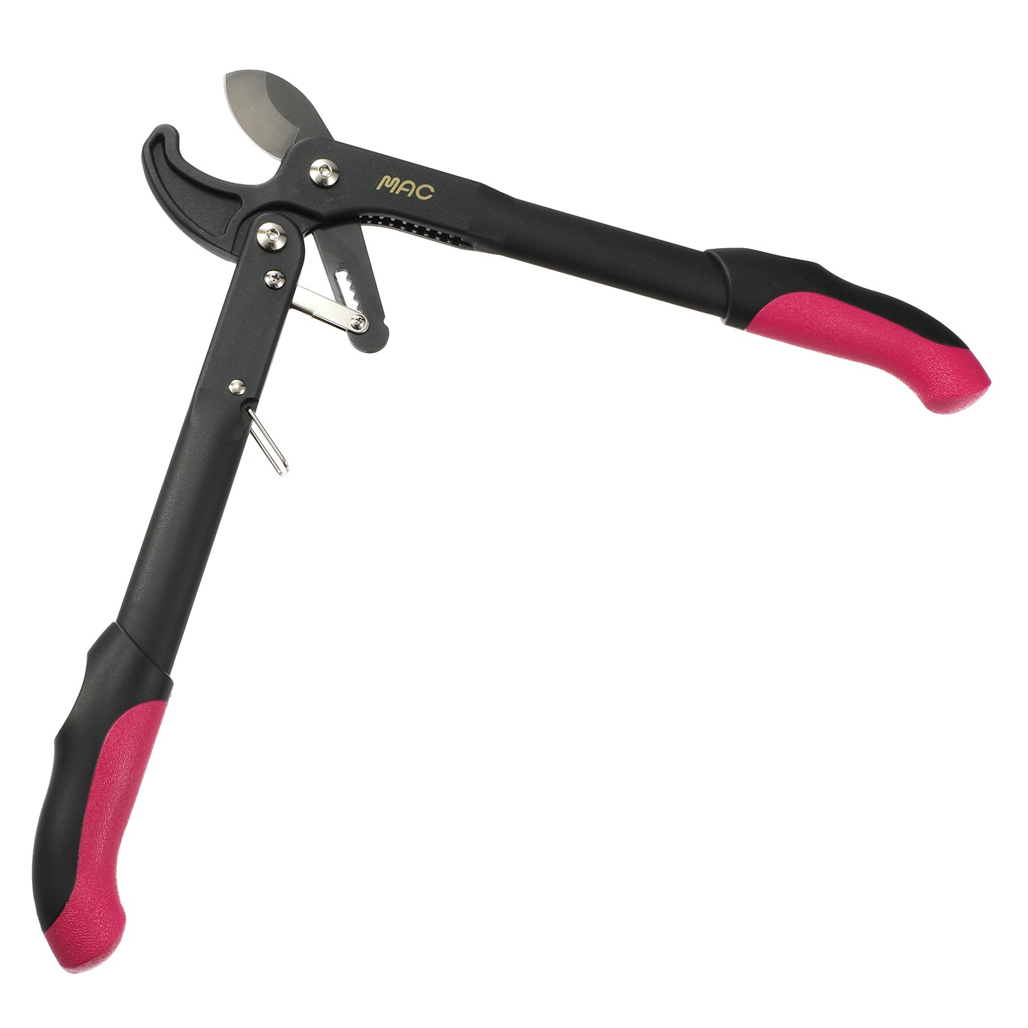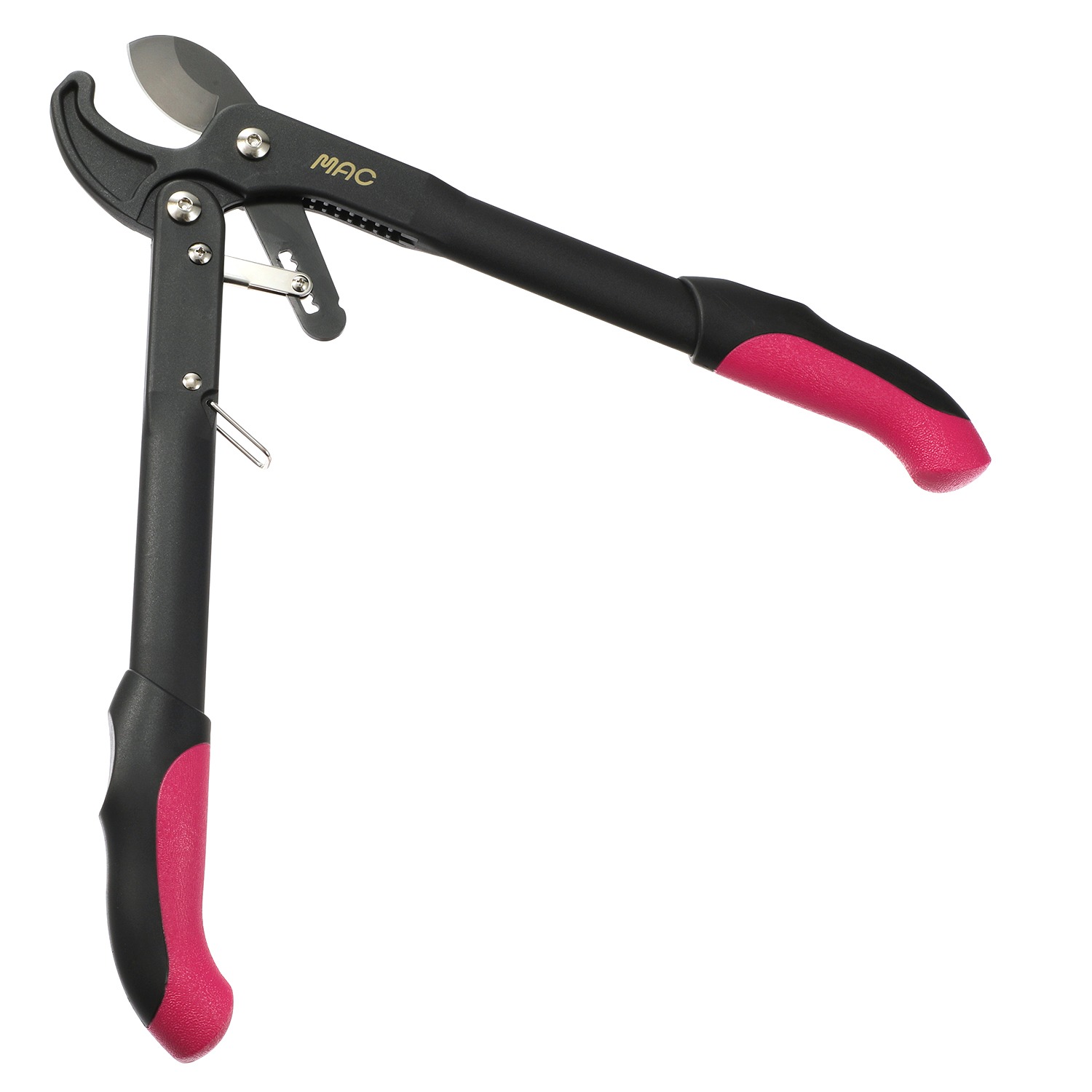 テコの原理を利用したラチェットギア搭載の太枝切ハサミ。