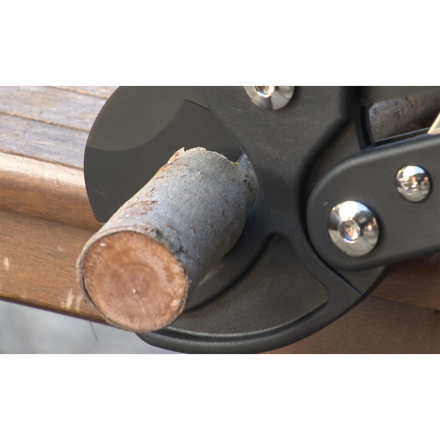 ラチェットギアの働きにより、ハンドルを数回開閉するだけで刃が枝にくい込んでいき、軽い力でラクに枝を切ることができます。