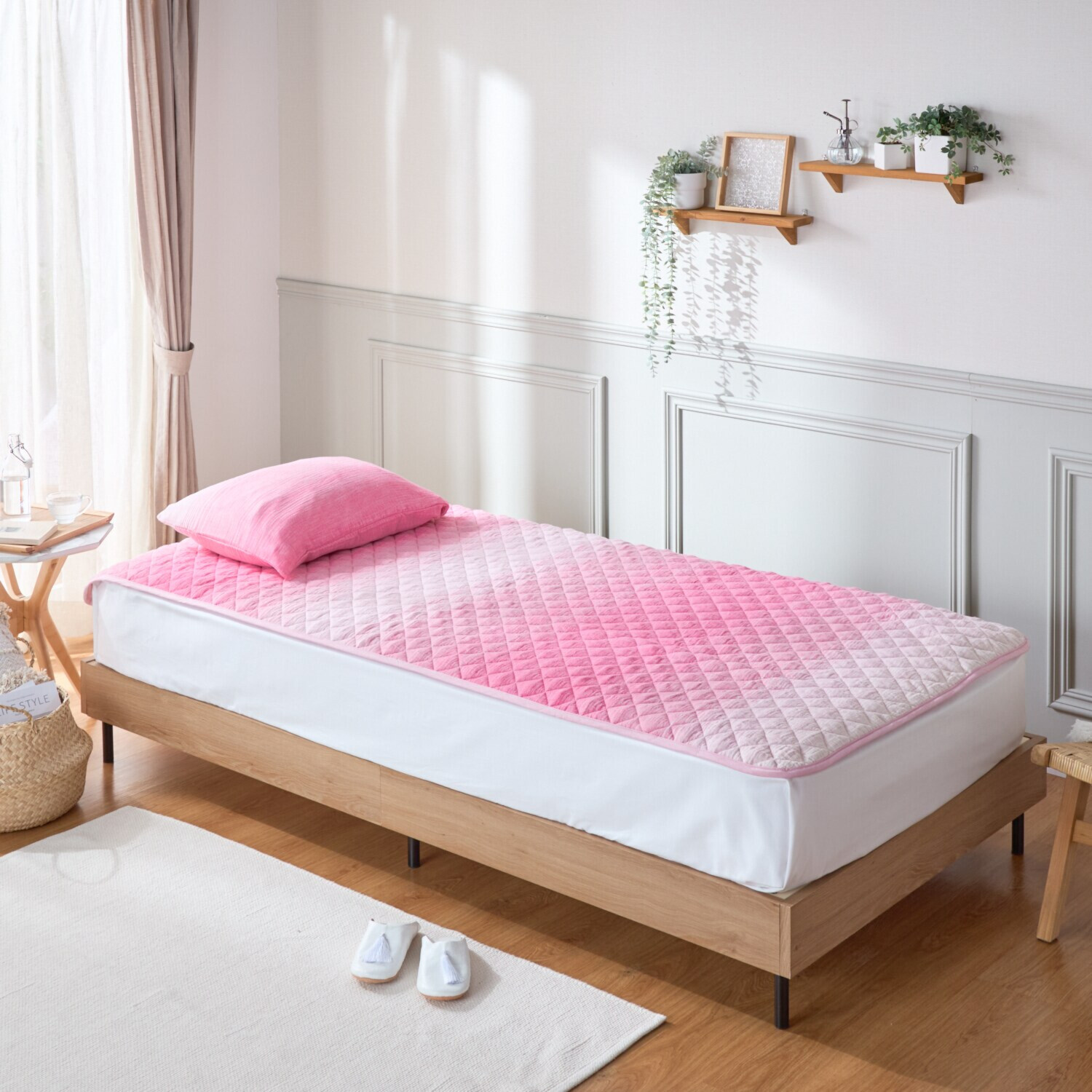 表生地にやさしくふんわりとした肌触りで心地よく身体を受け止めてくれる、コットン100%の3重ガーゼを、詰め物に抗菌わたをブレンドした中わたを使用した敷きパッドです。