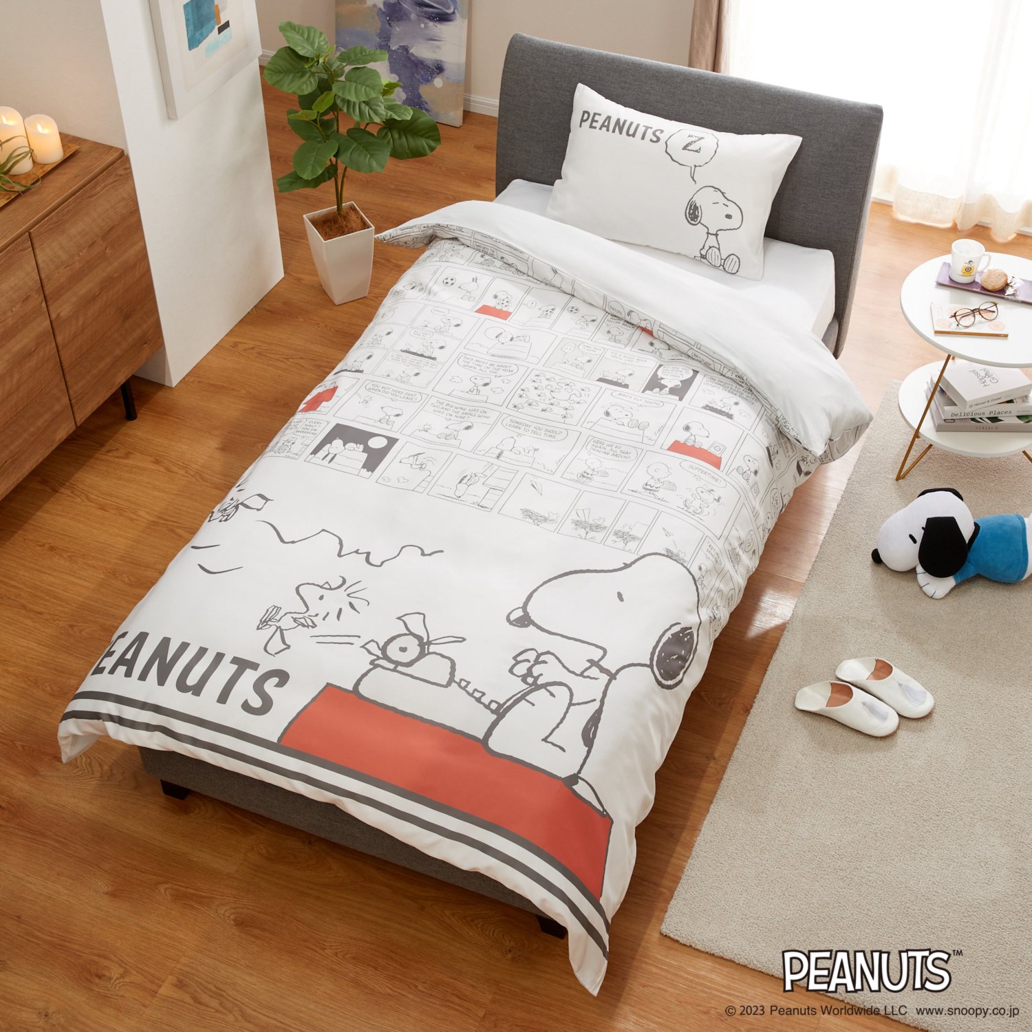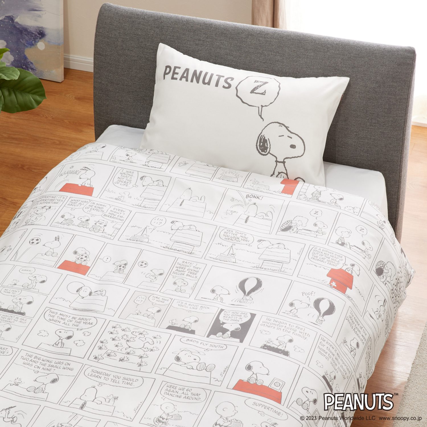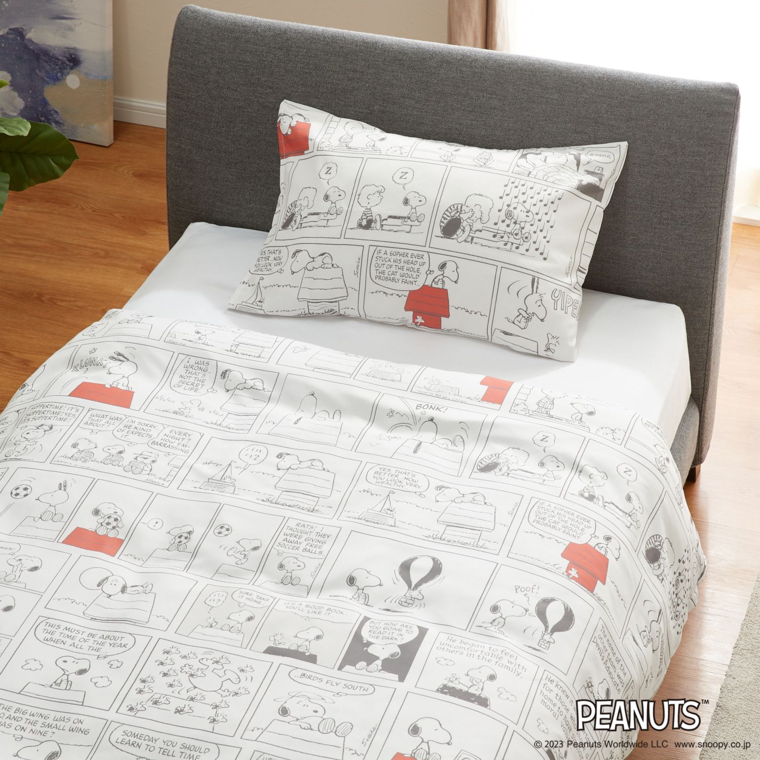 <西川>より、ピーナッツのコミックを切り取ったデザインの、掛けふとんカバーとピローケースのセットです。