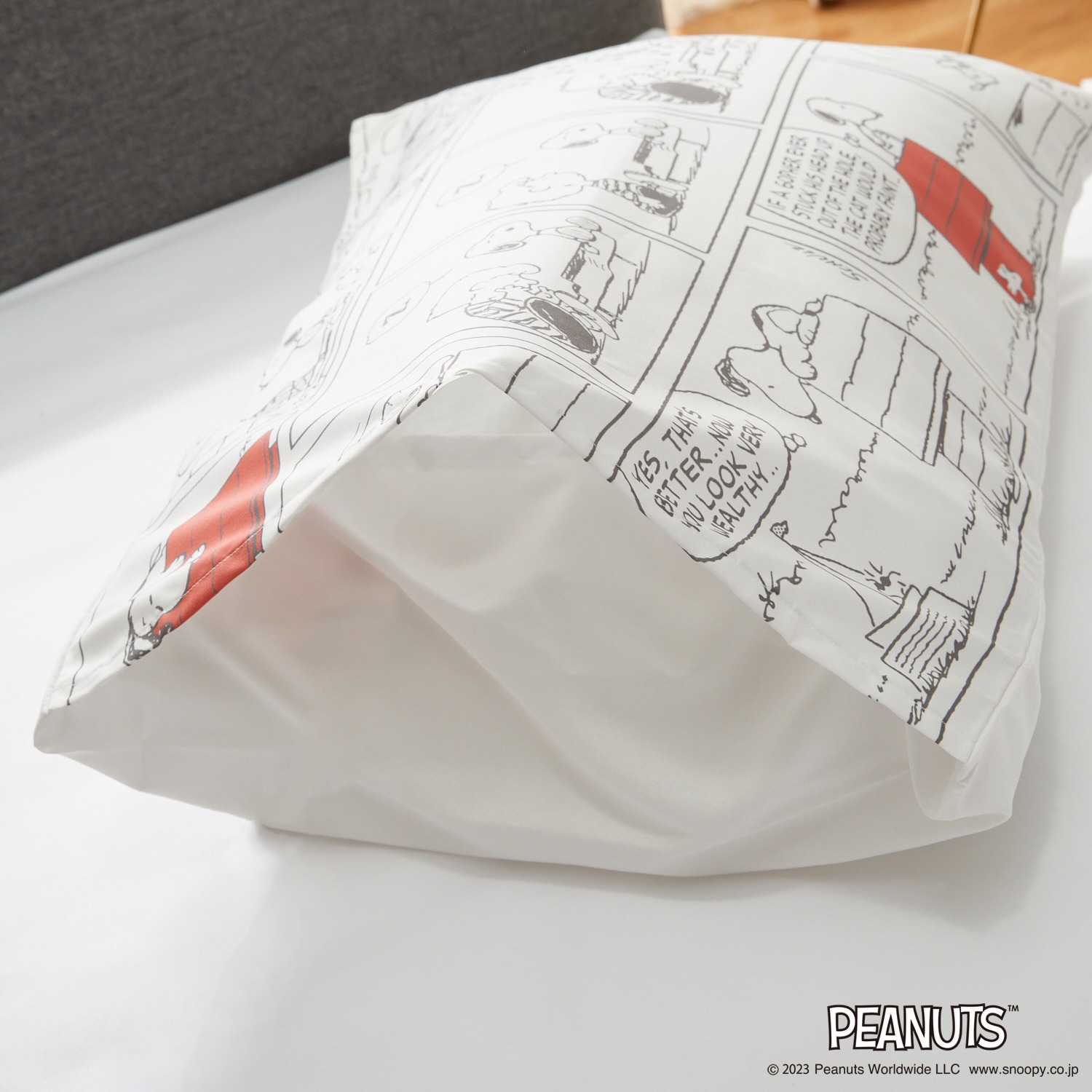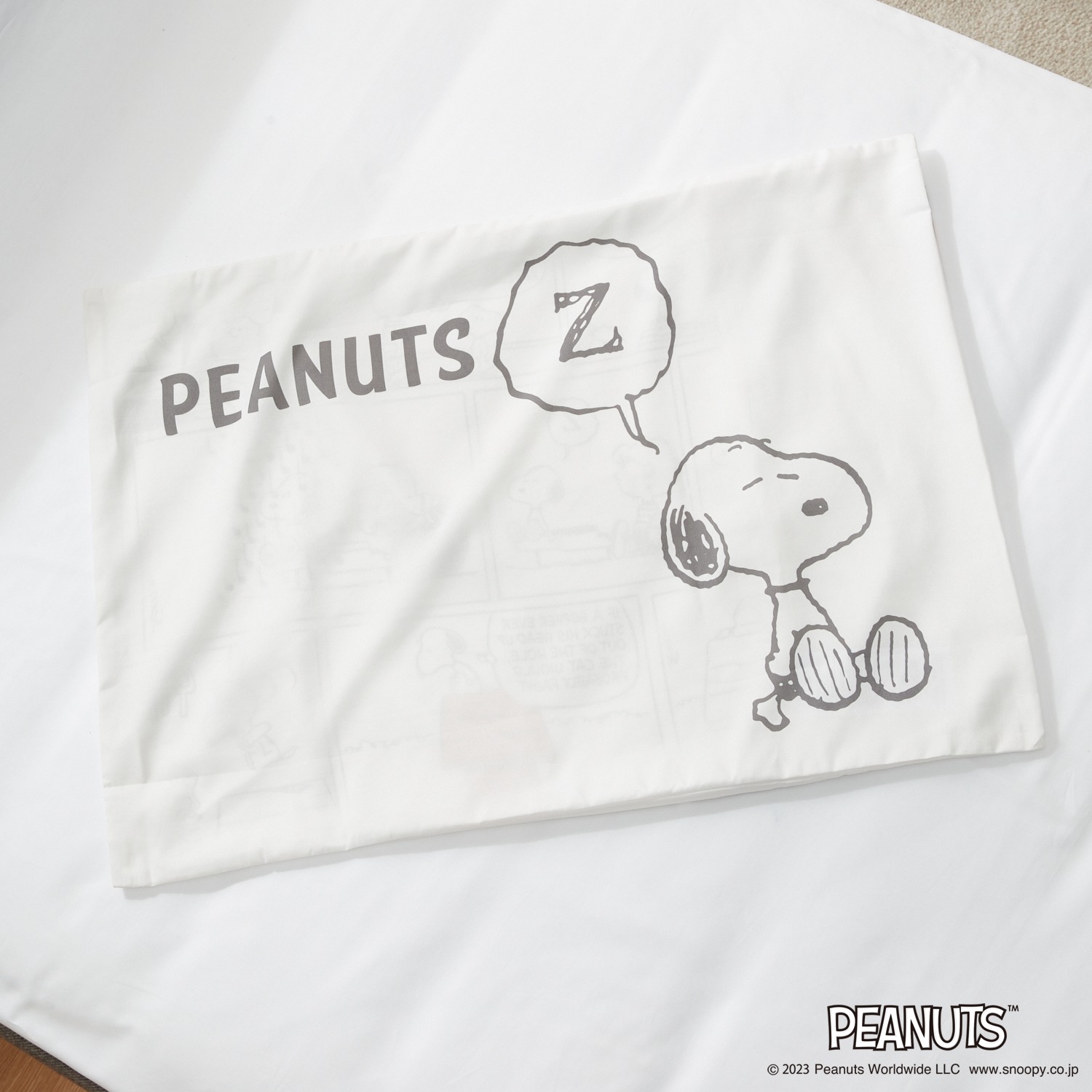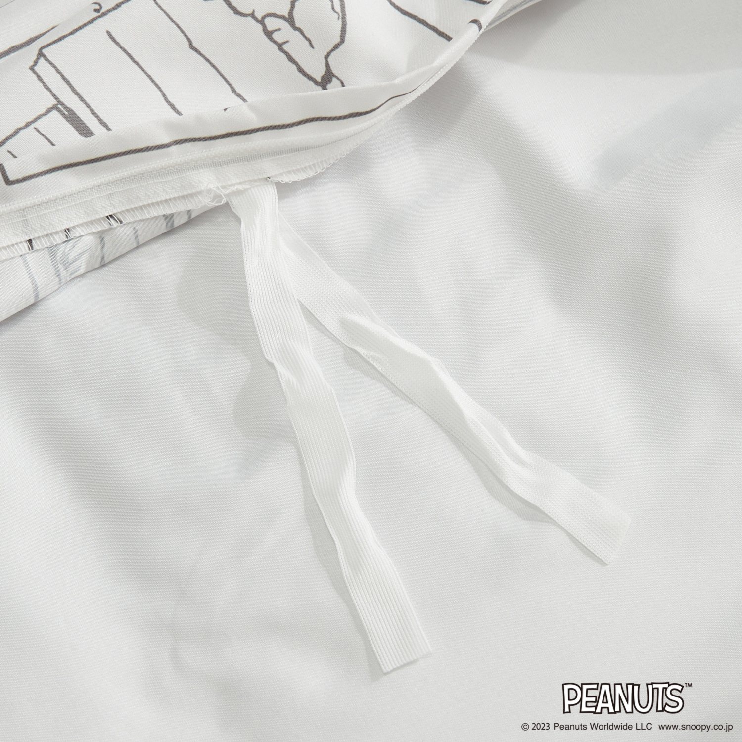 <西川>より、ピーナッツのコミックを切り取ったデザインの、掛けふとんカバーとピローケースのセットです。