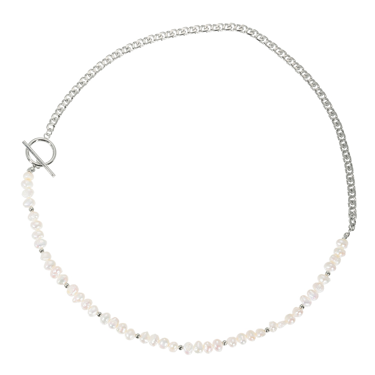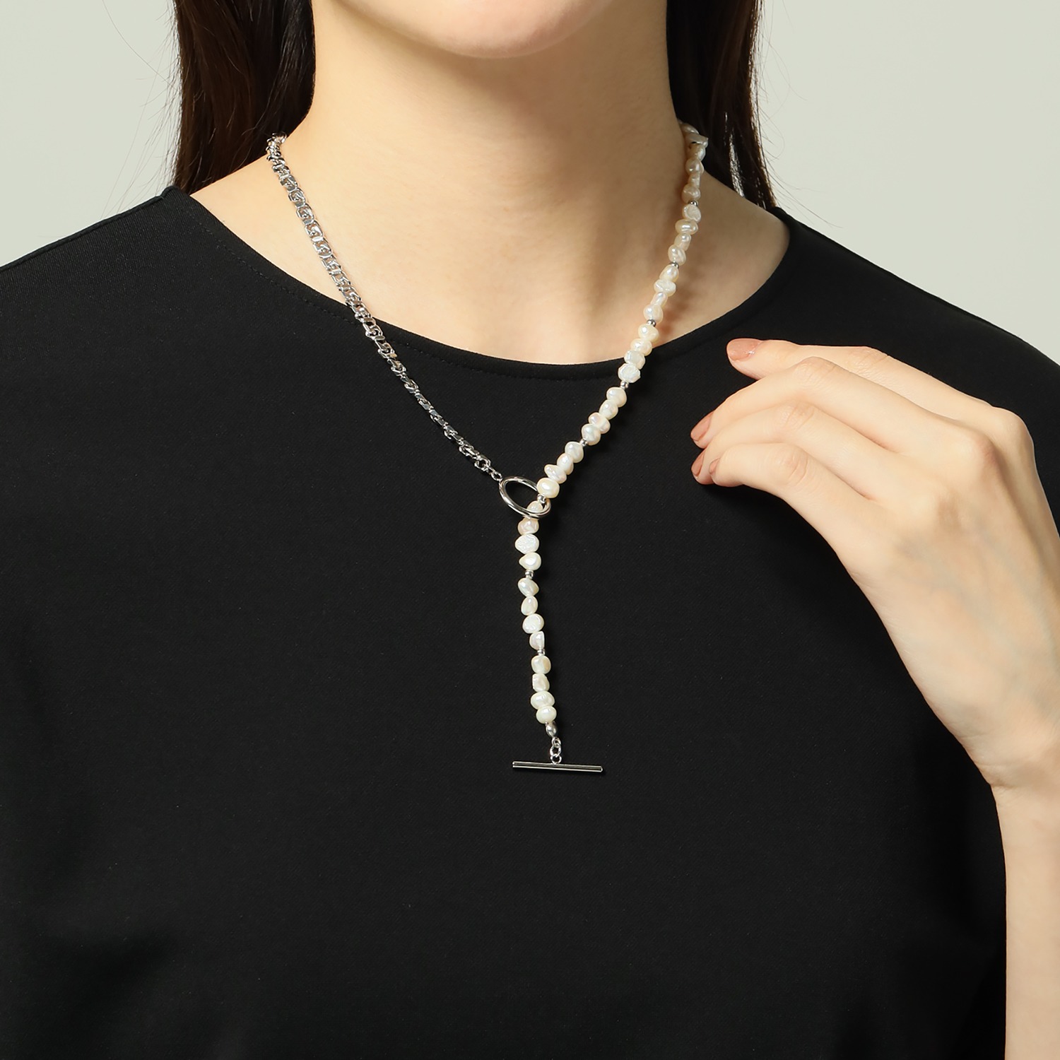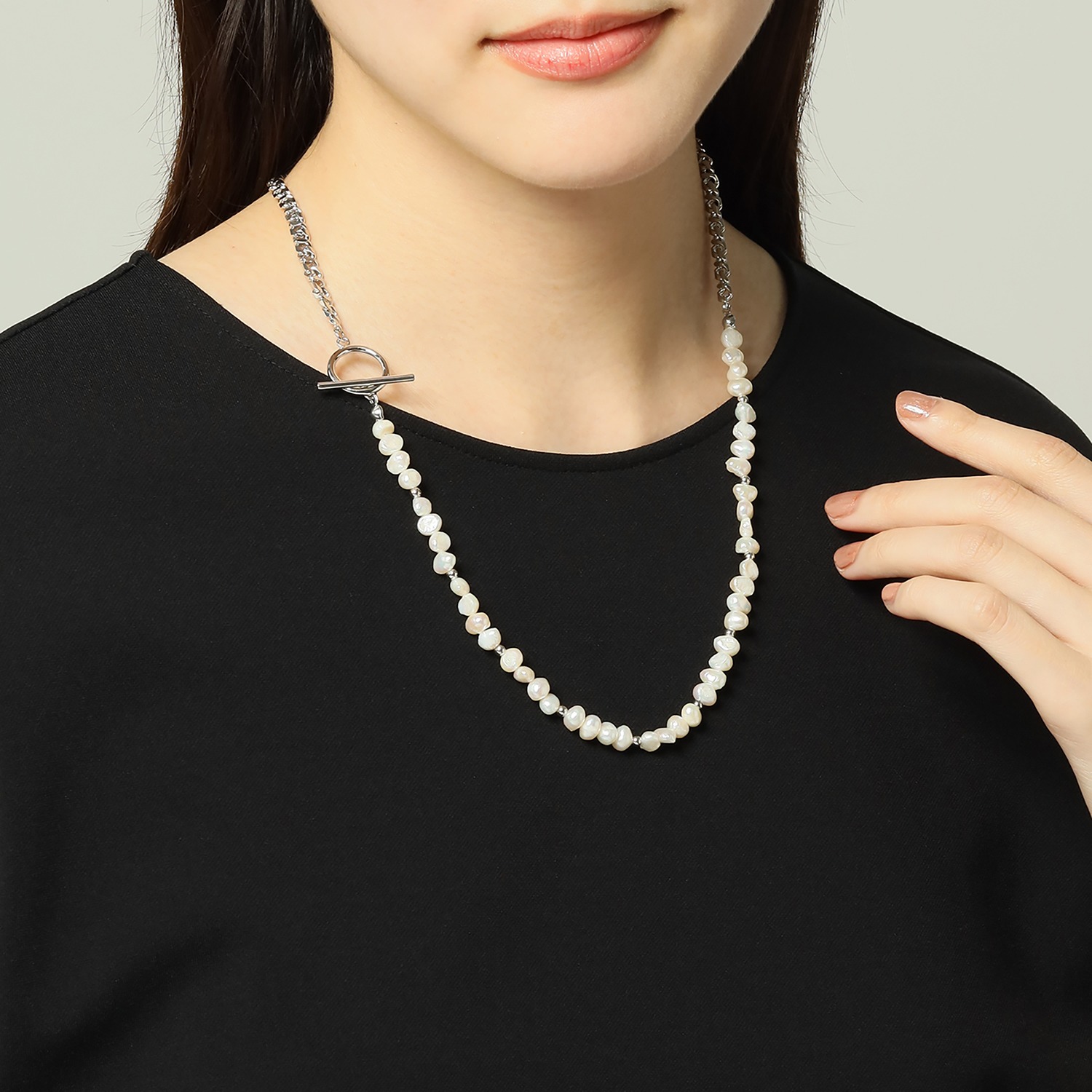 淡水パールの優雅な輝きと喜平チェーンのシャープな煌めきが相まって、エレガントでスタイリッシュな雰囲気を醸し出します。