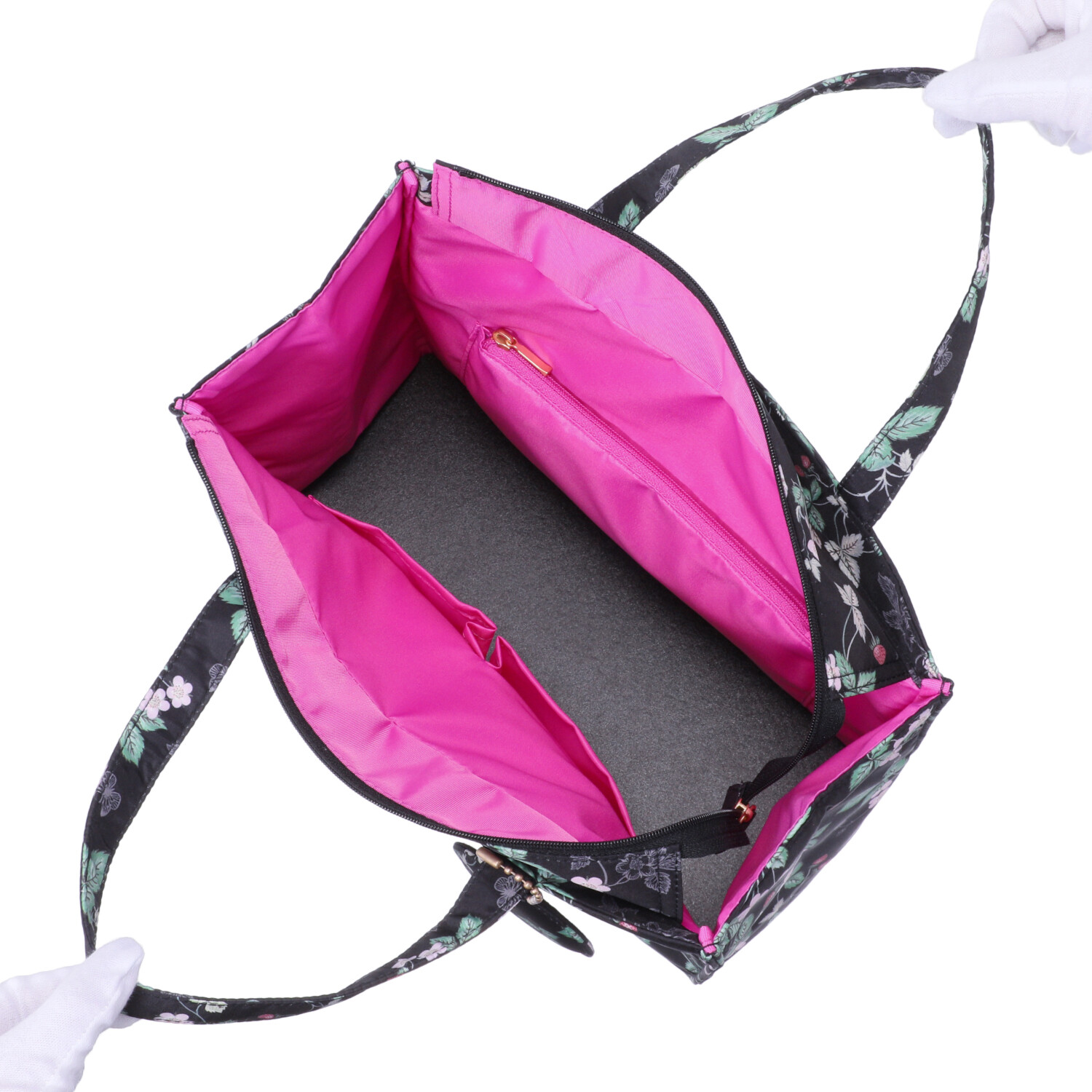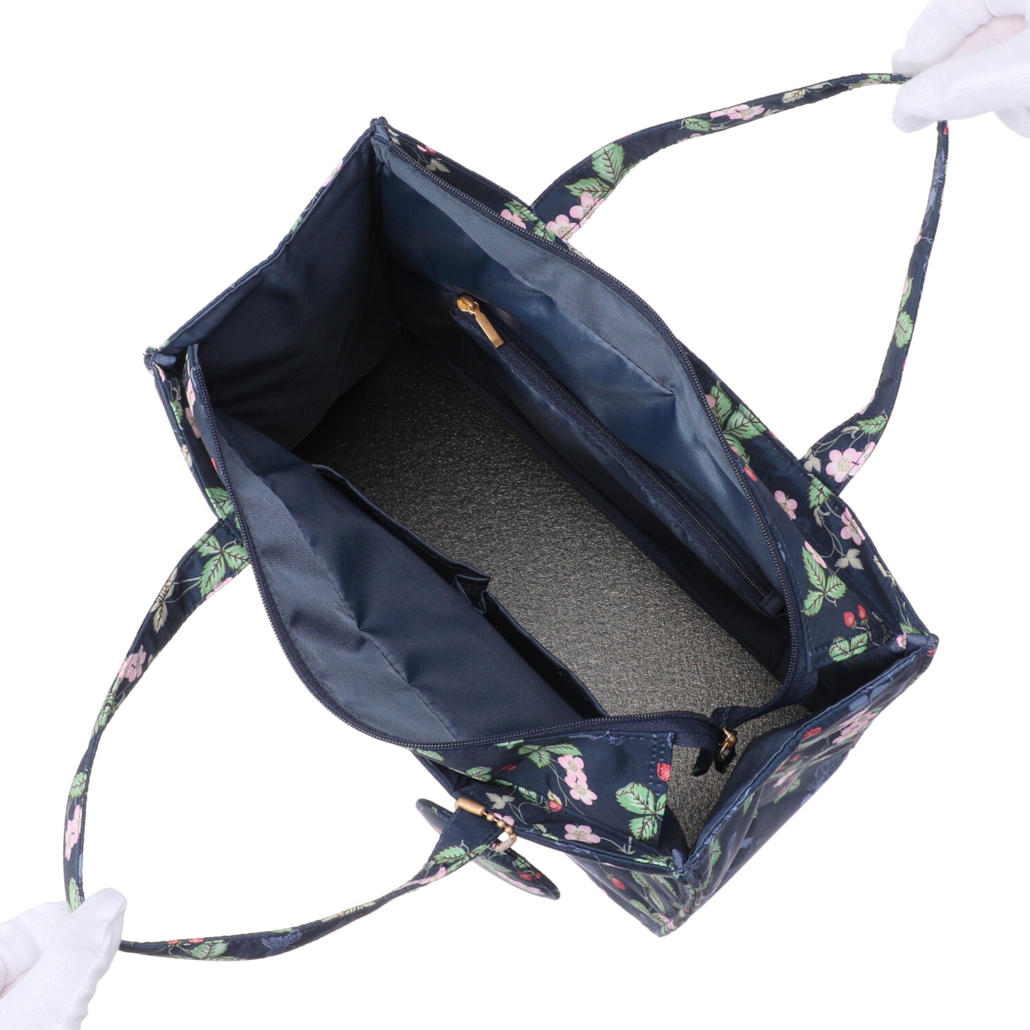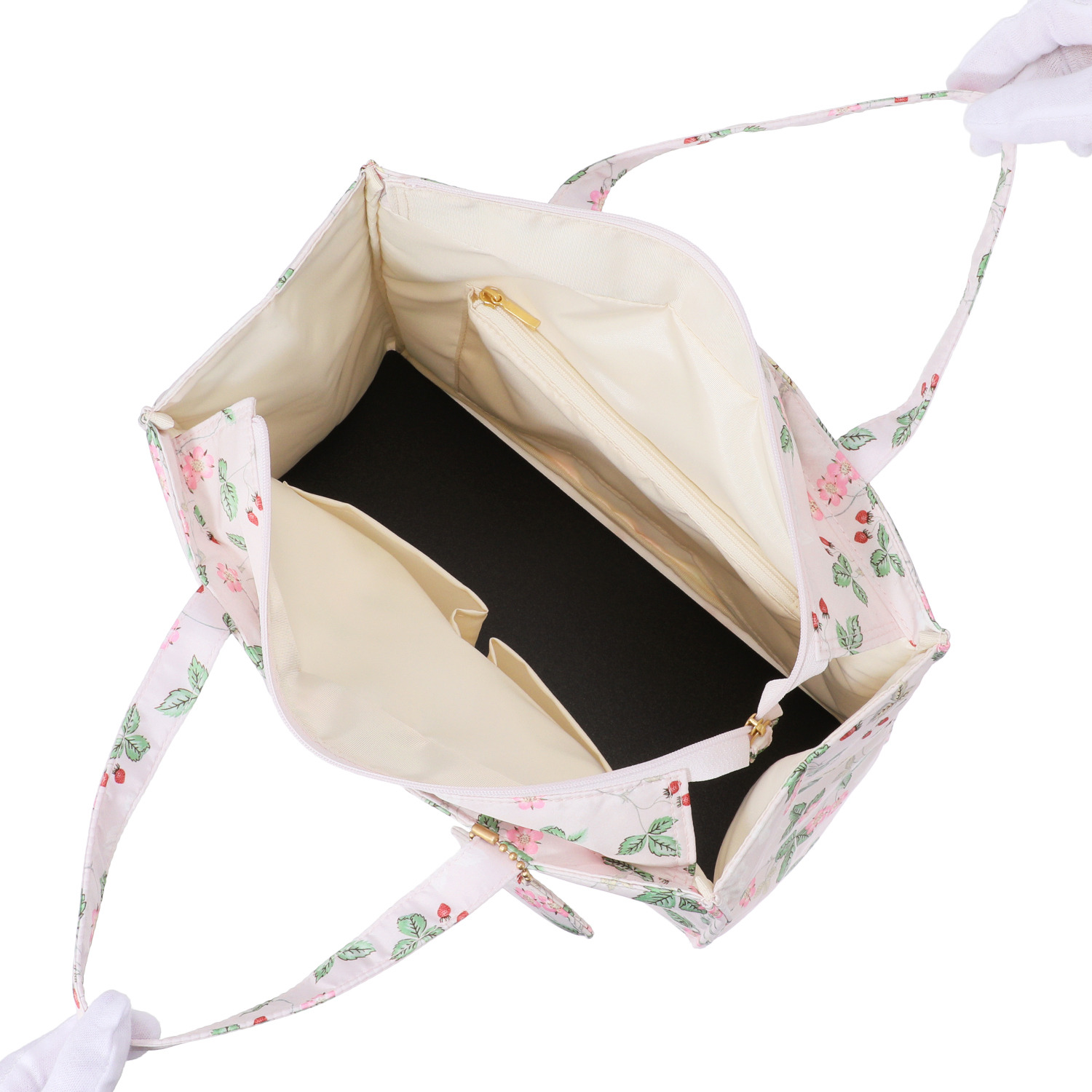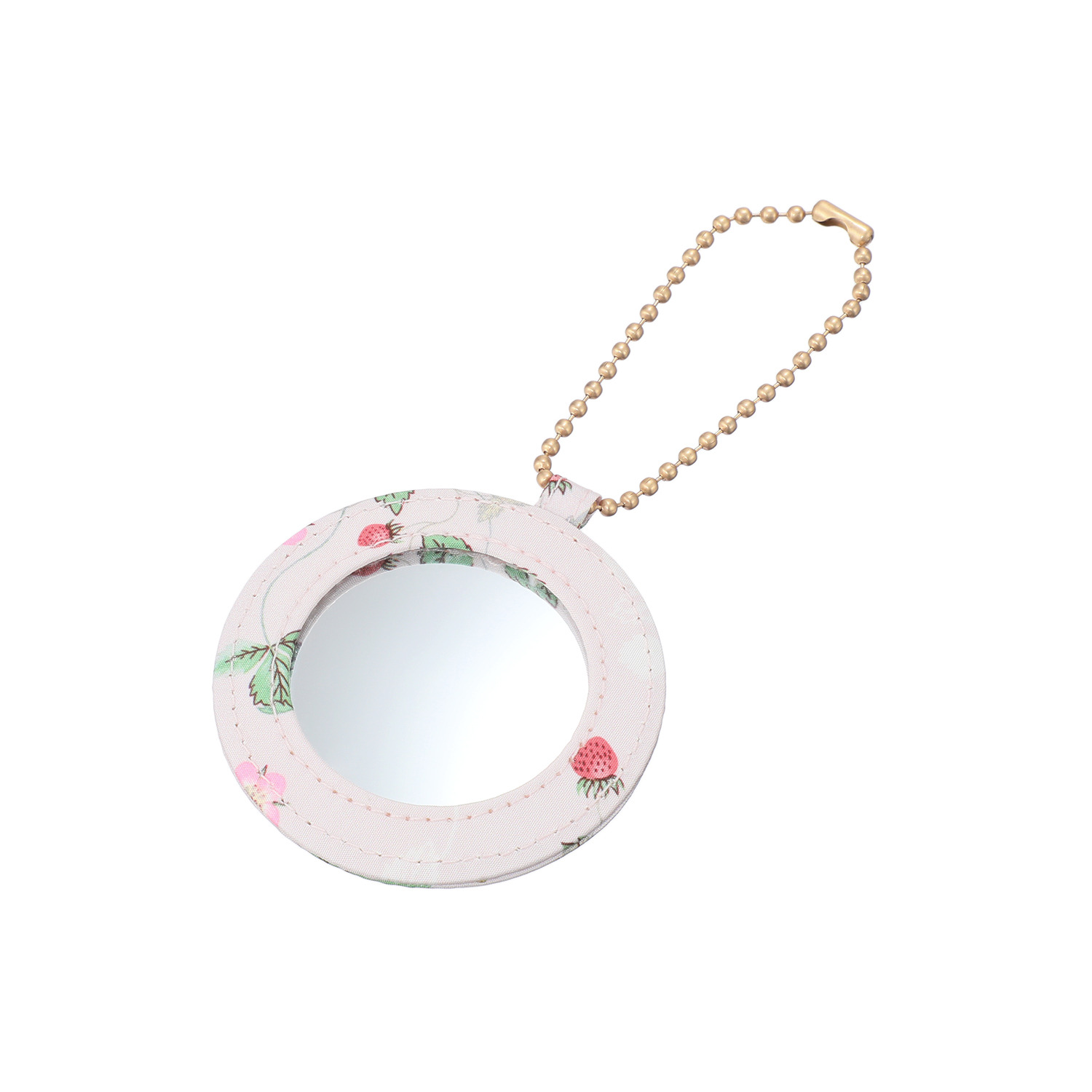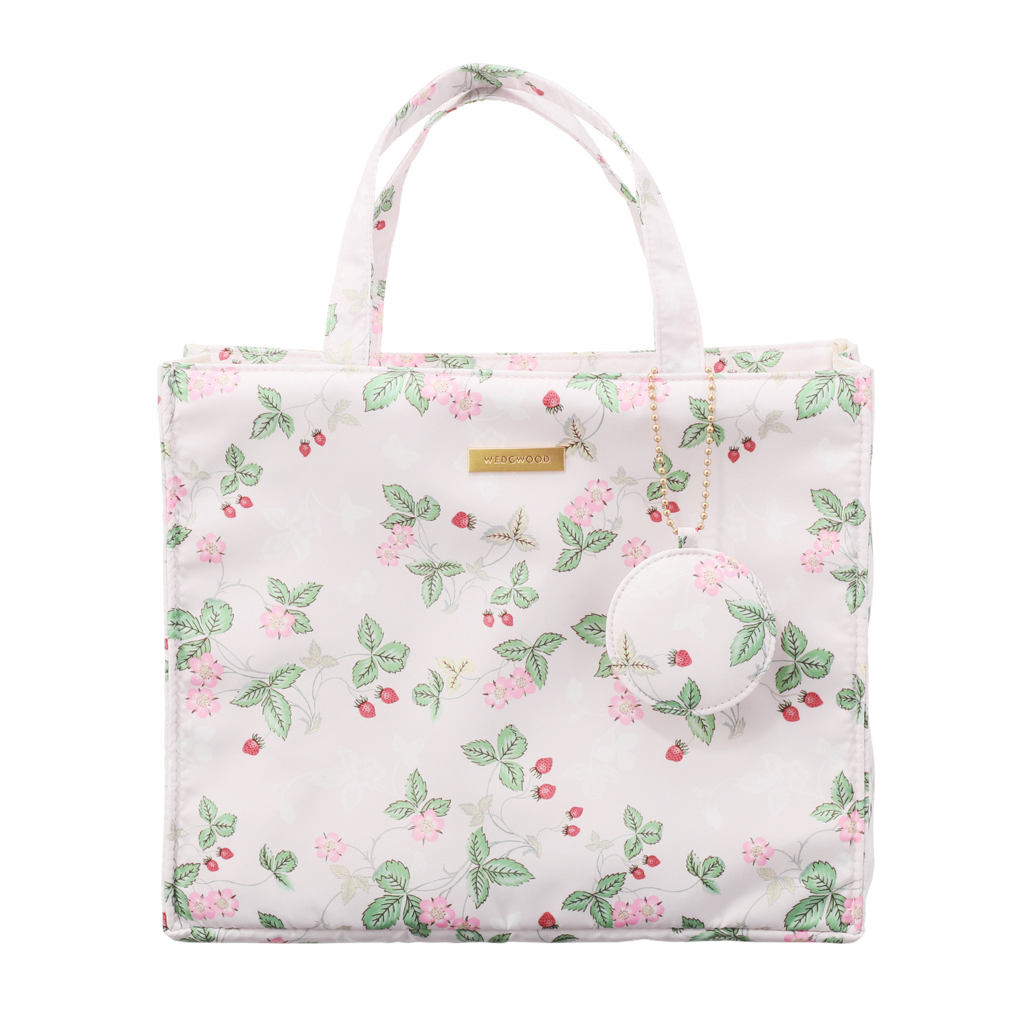 <ウェッジウッド>を代表する人気の“ワイルドストロベリー”をプリントで表現した、はっ水デイリースクエアトートバッグと、チェーン付きのミラーのセットです。