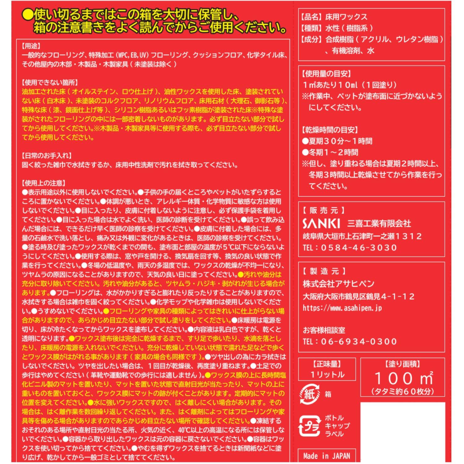 アサヒペン独自配合の消泡剤配合なので、ワックスを塗るときにできる泡立ちやムラが乾燥とともに消えてキレイな仕上がりになります。
