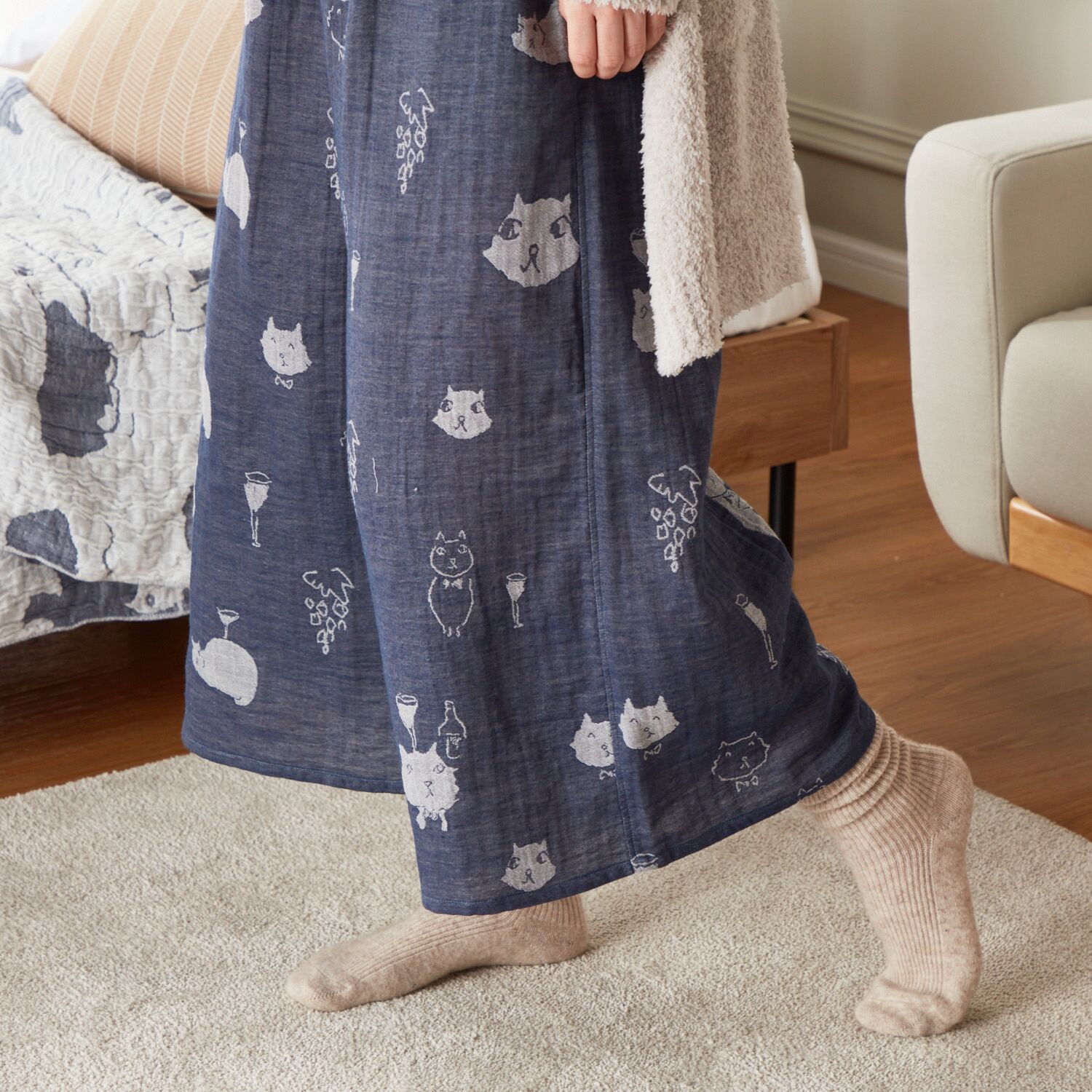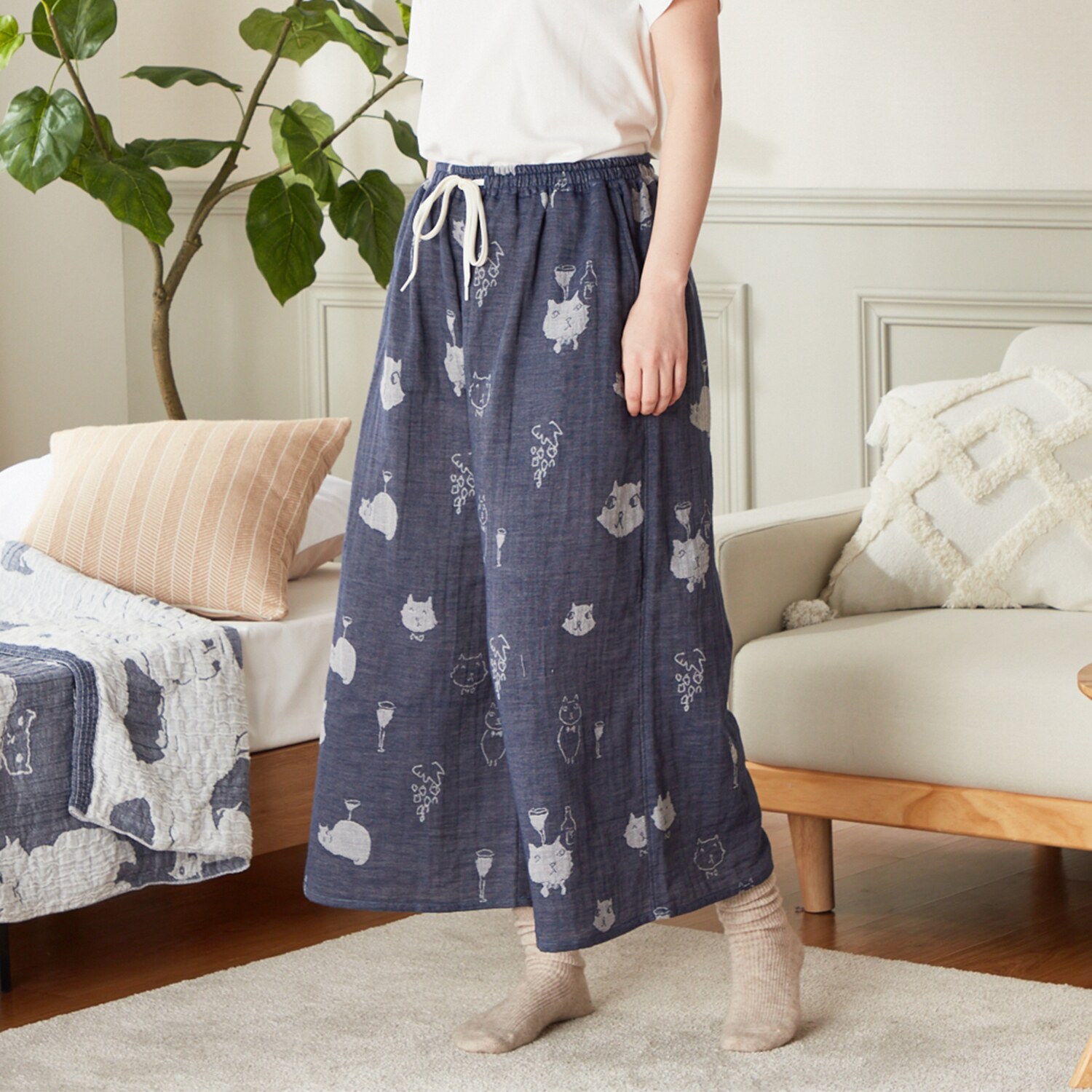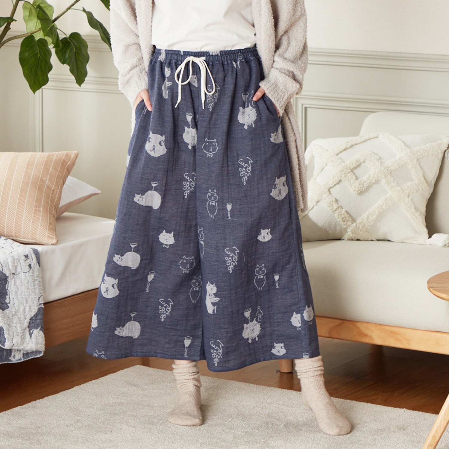 イラストレーターの小渕暁子(akiko obuchi)氏と、1946年創業の大阪泉州の老舗タオルメーカー(株)成願がお作りした、上質な肌触りのかわいいガウチョパンツです。