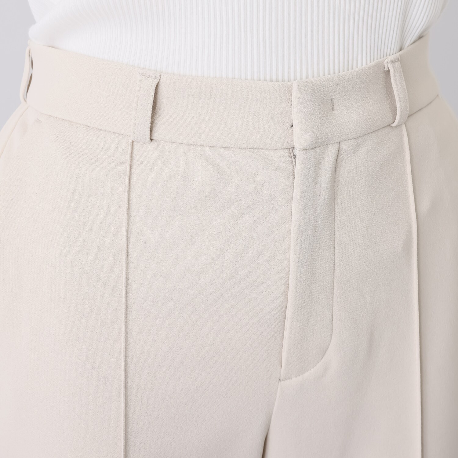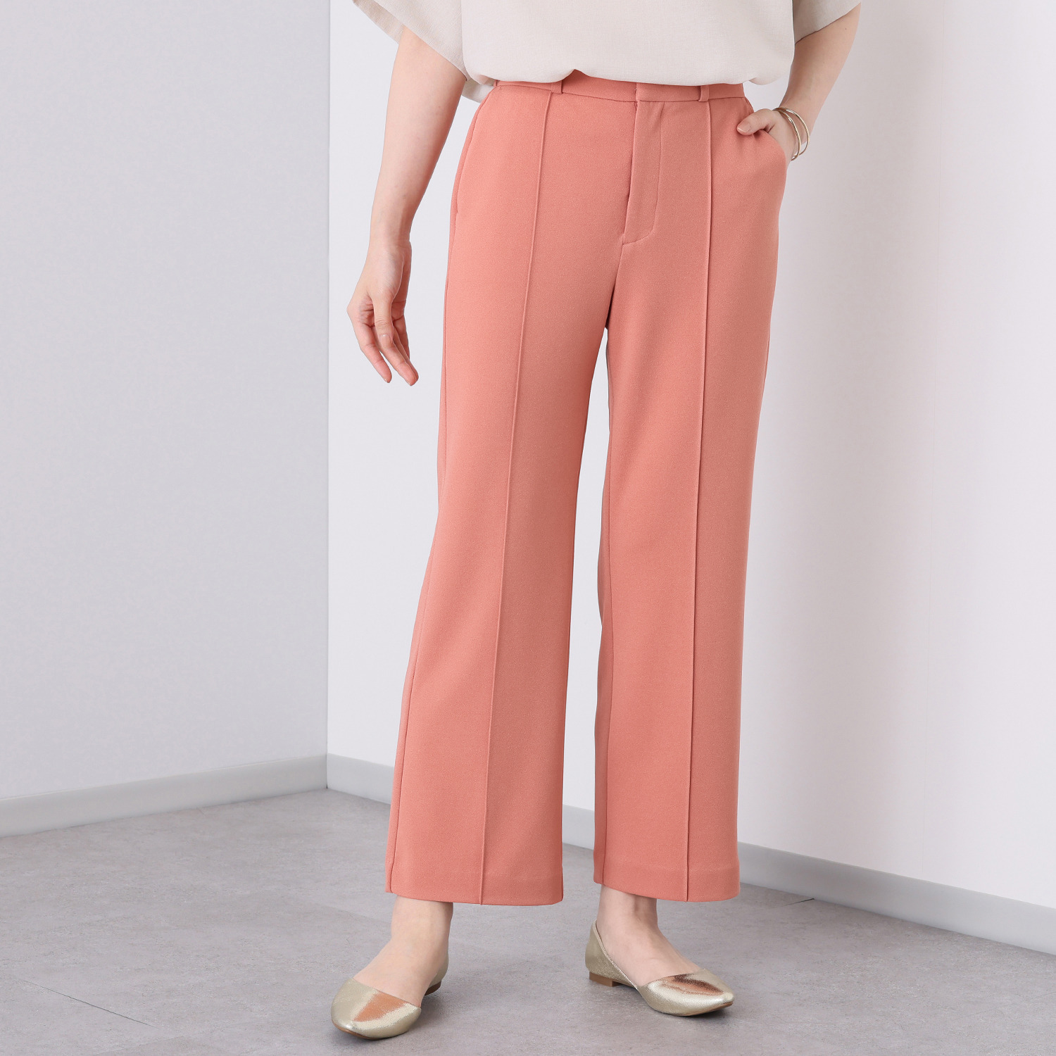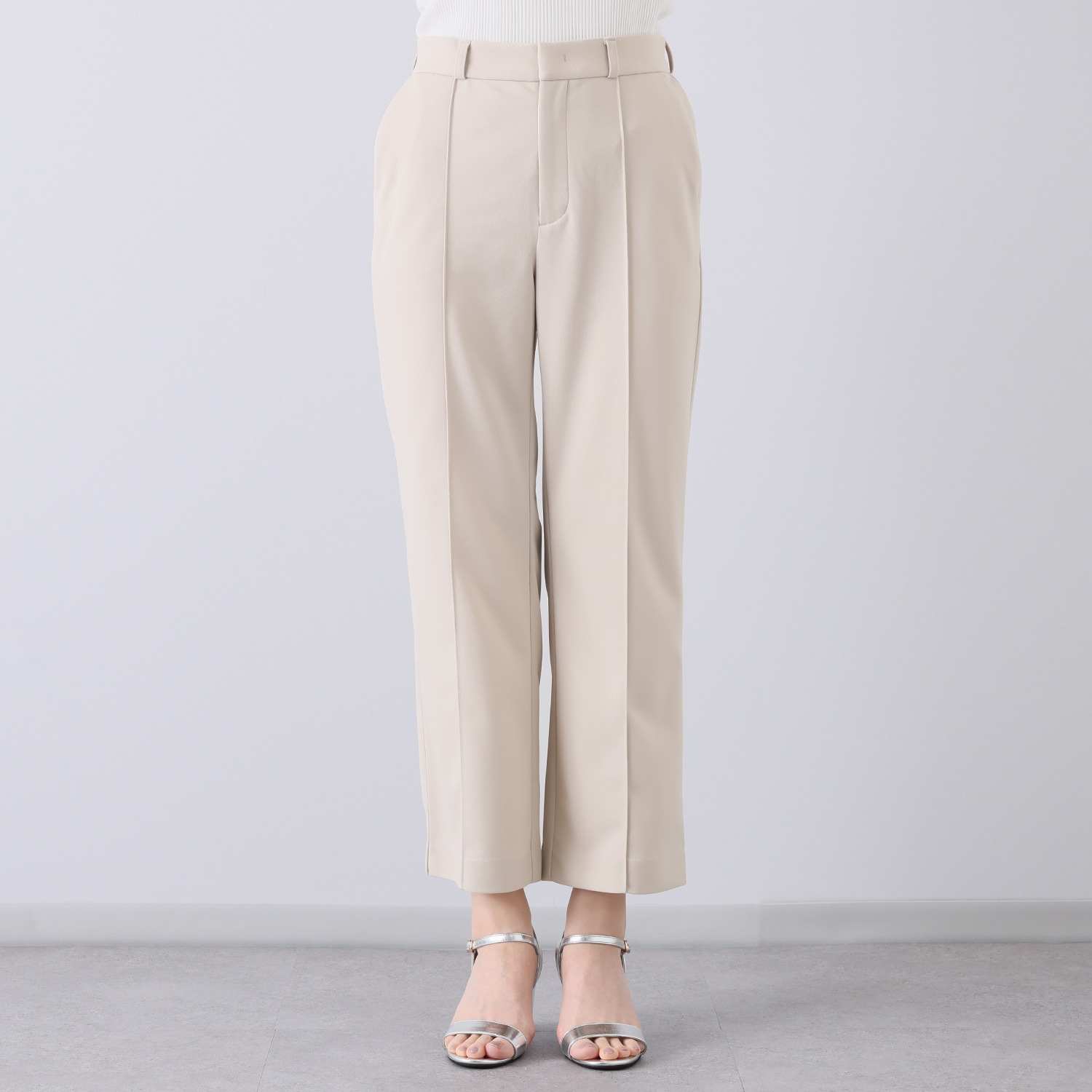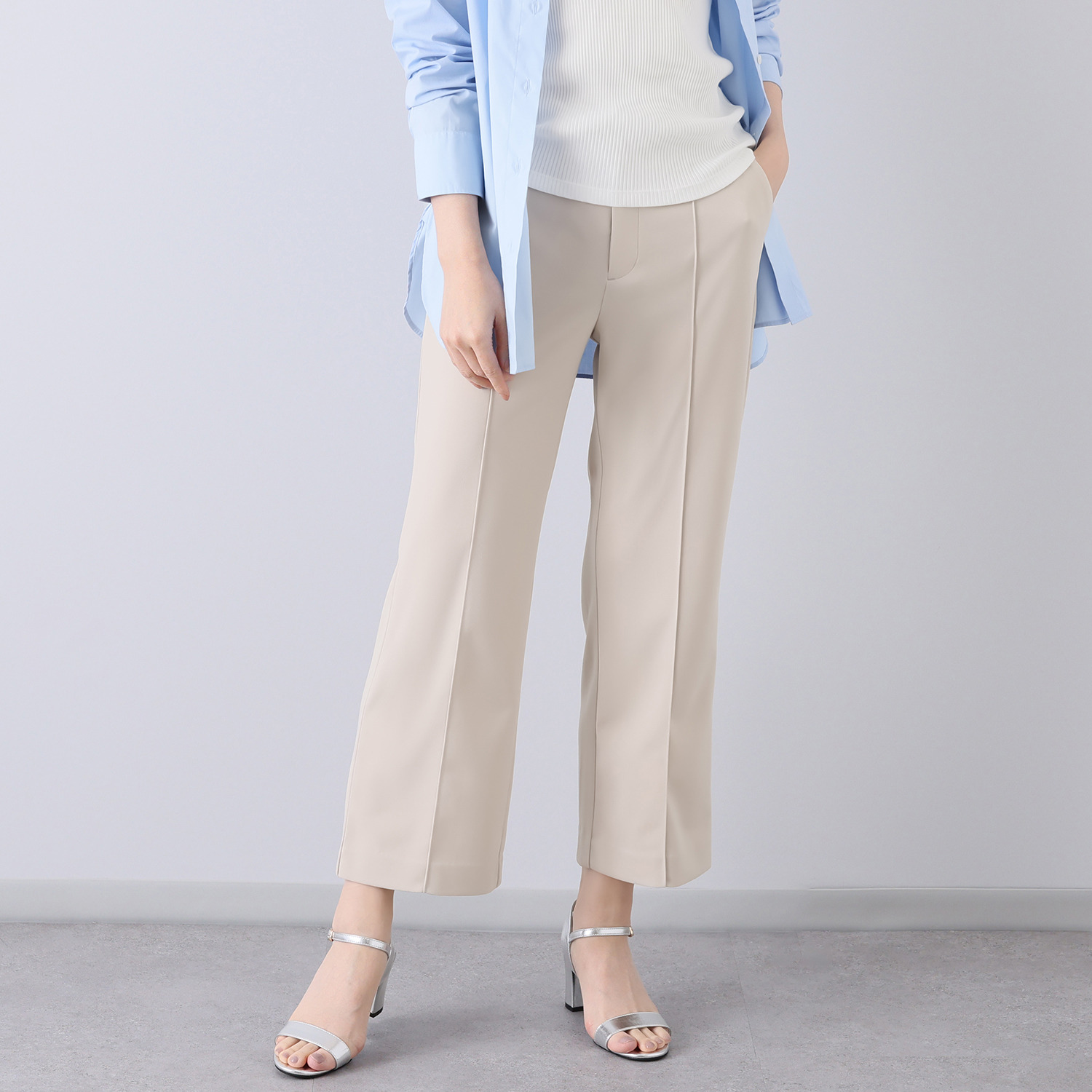 センターピンタックをほどこすことで、視覚効果により脚を細く見せ、センターラインが洗濯しても消えず、いつでもきれいなスタイリングに。