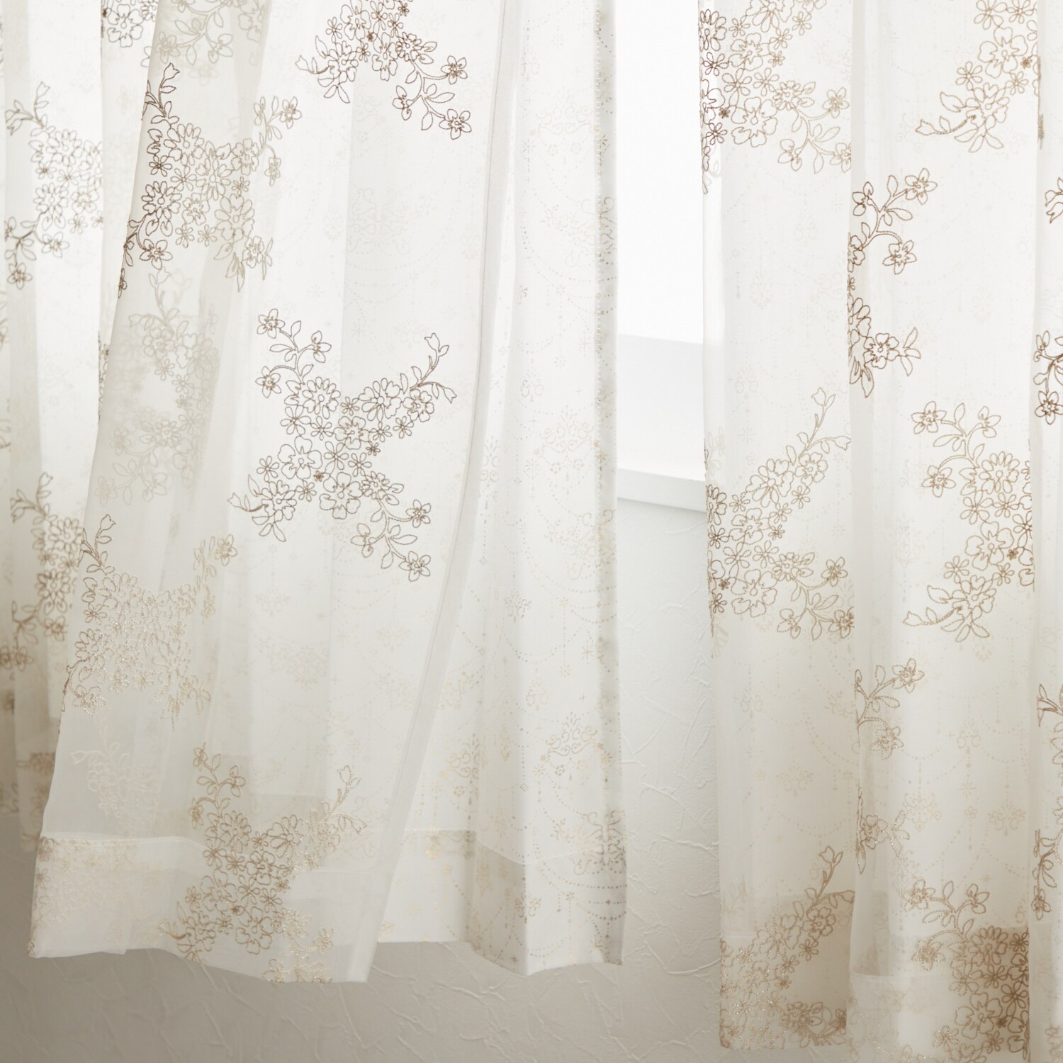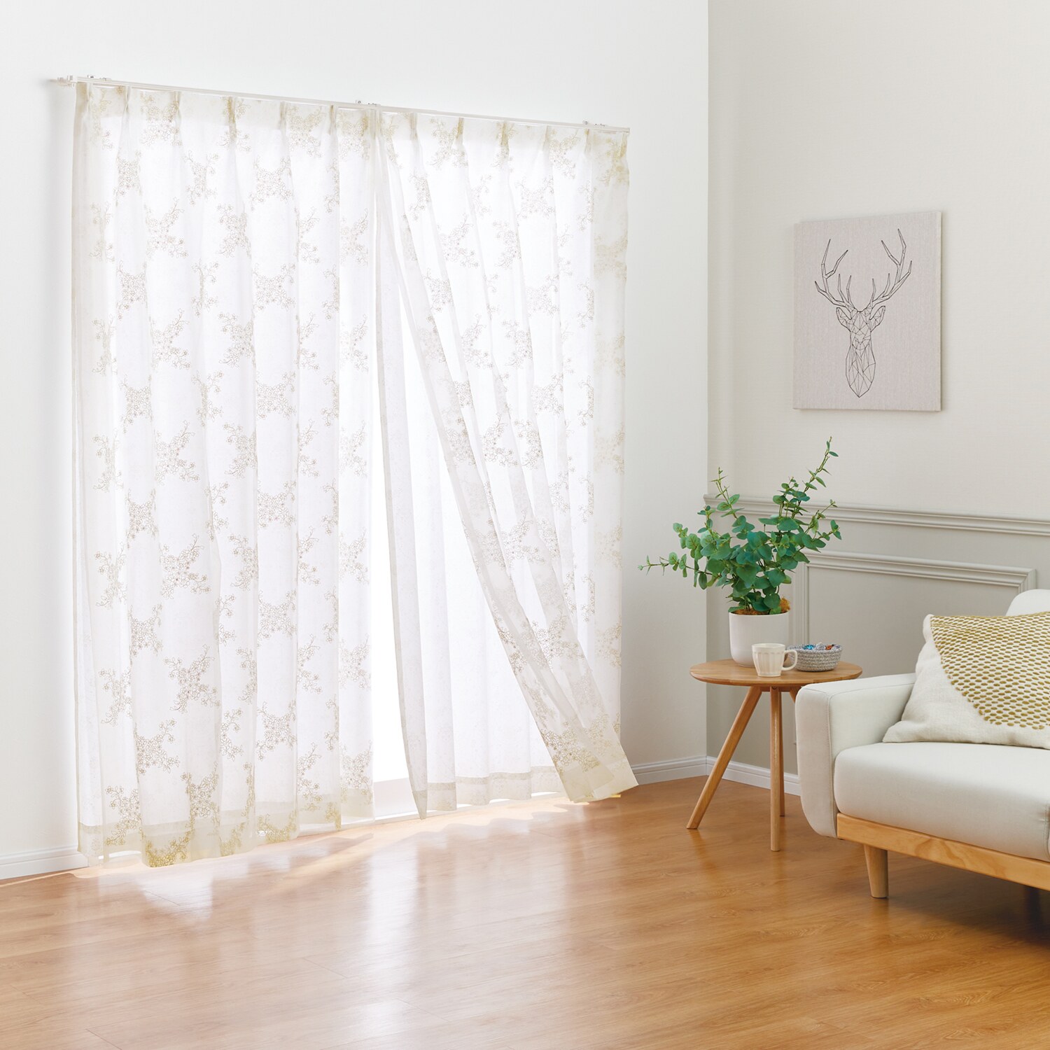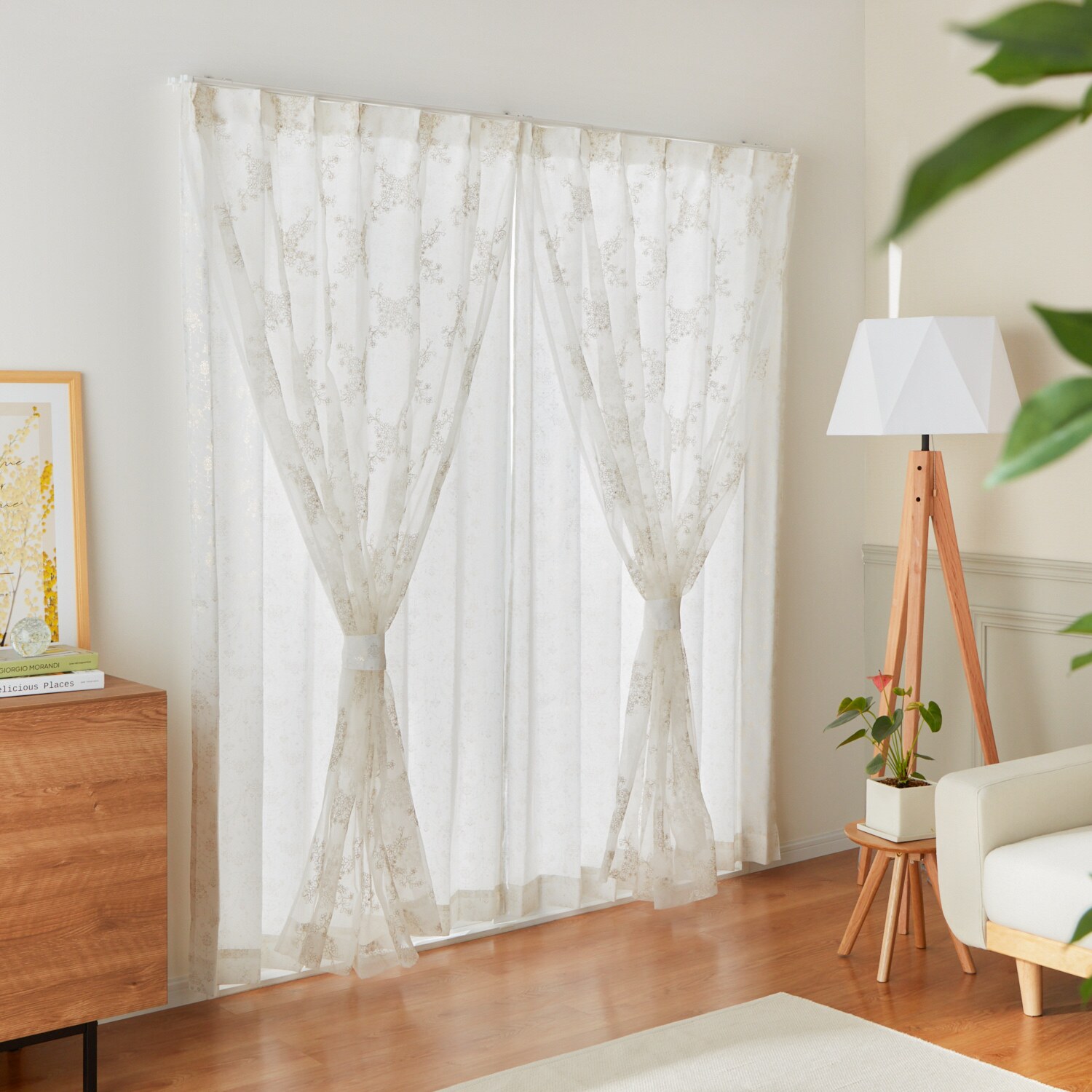 ドレッシー UVカット箔プリント生地 &刺しゅうオーガンジー 二重レースカーテン2枚組 “ジュエル” <100×198cm>