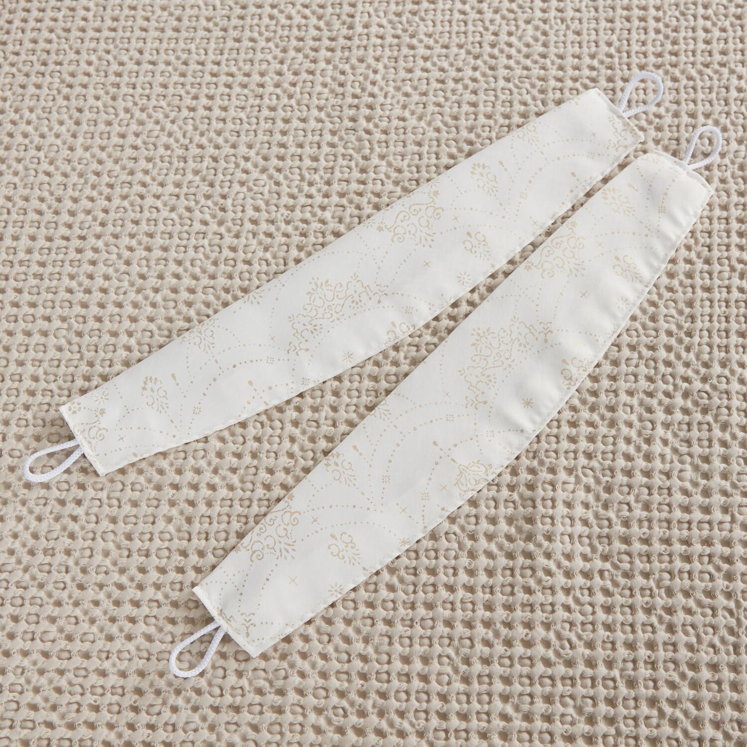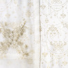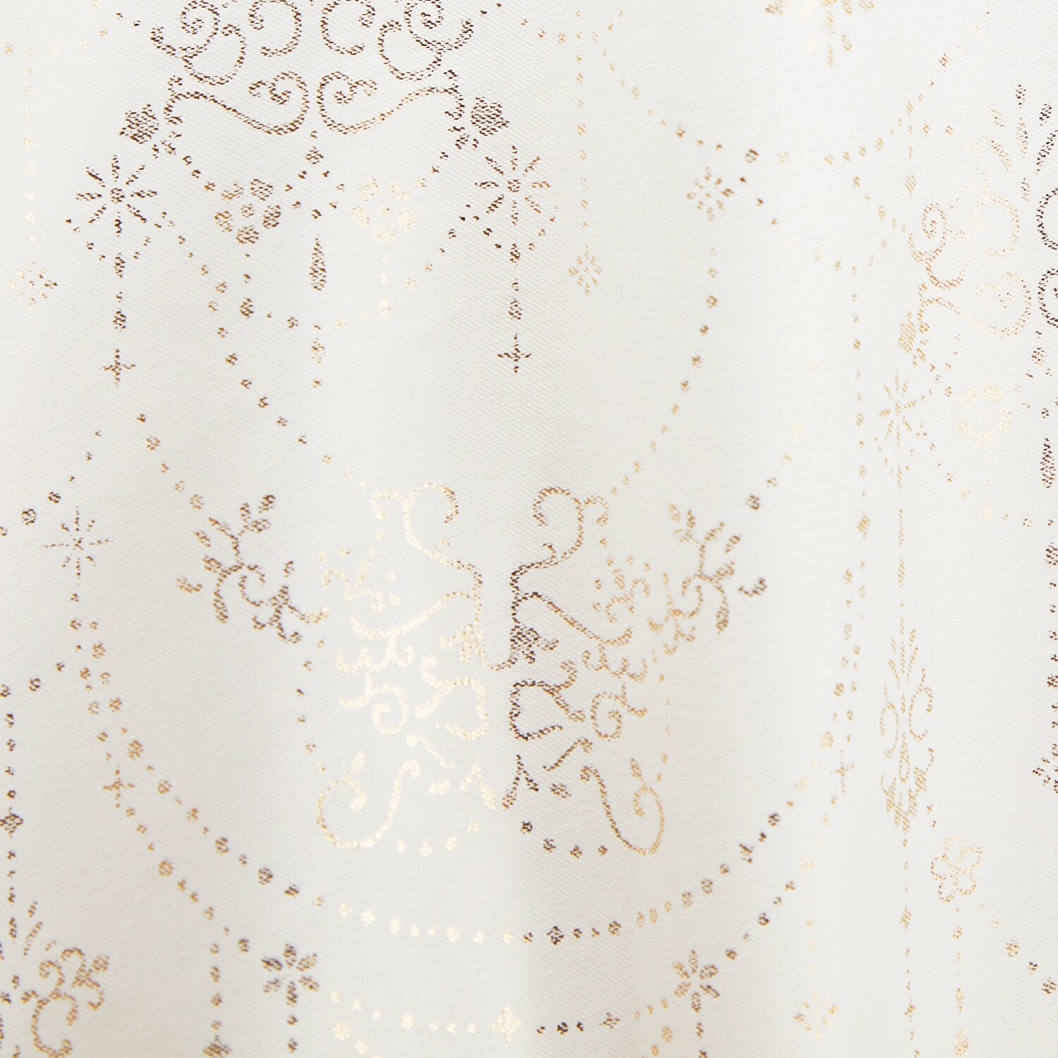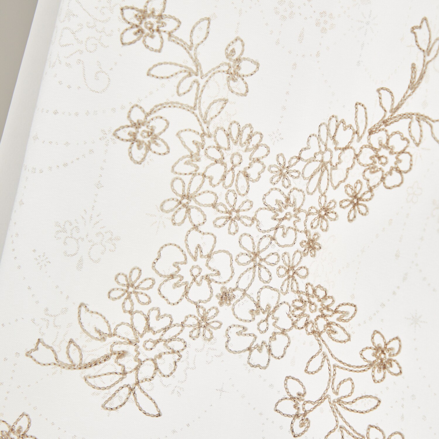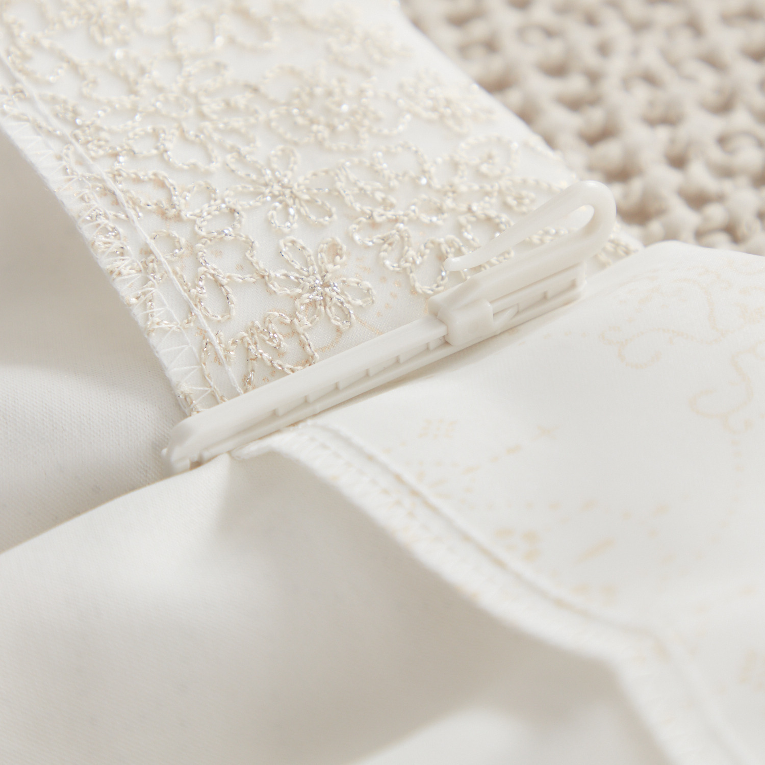 <ドレッシー>より、気品高いブライダルドレスをイメージし、繊細なオーガンジー刺しゅうをほどこした生地と、キラキラしたジュエリーのような美しい半箔プリントをほどこした生地でお作りした、贅沢仕様の二重レースカーテンです。